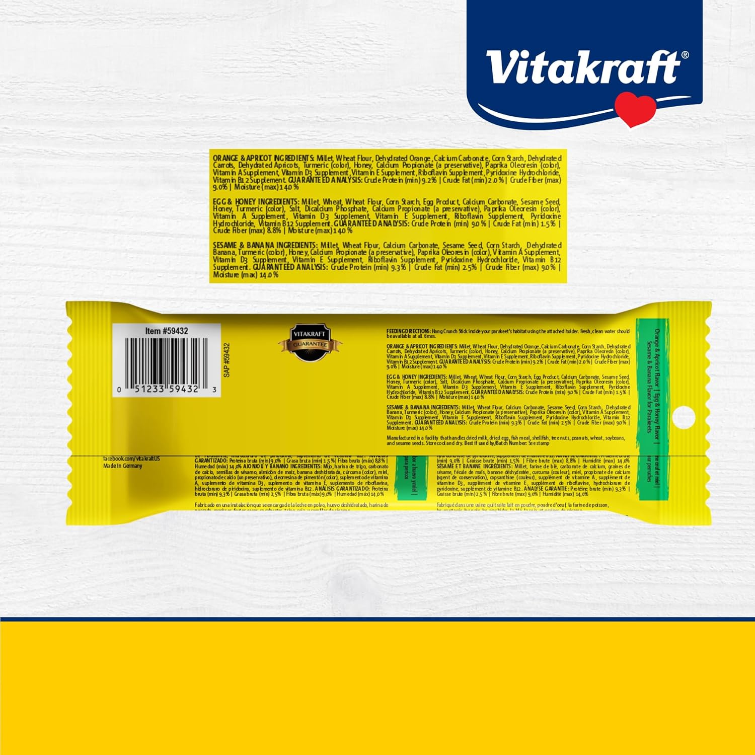 - Included Components: Vitakraft Crunch Sticks Variety Pack Orange & Apricot Flavor, Egg & Honey Flavor, Sesame & Banana Flavor Treats for Parakeets, 2.4 oz