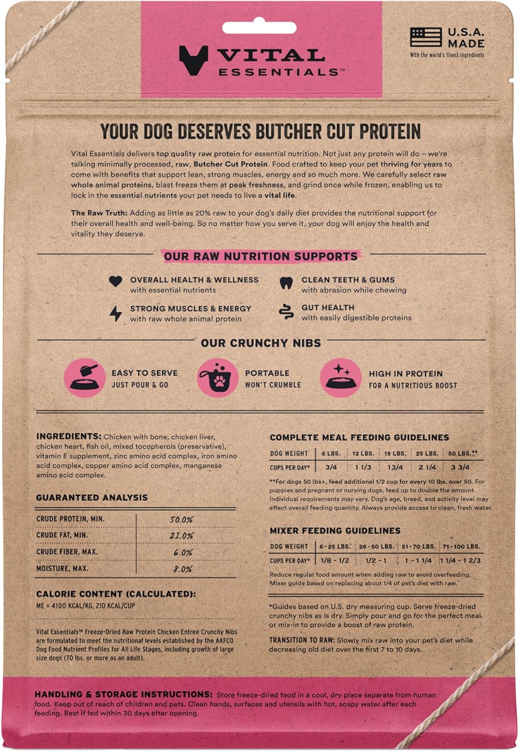 When it comes to feeding your dog a raw diet, superior protein provides superior benefits. Vital Essentials Freeze Dried Raw Chicken Dog Food Nibs are packed with premium butcher cut raw protein, responsibly sourced and humanely harvested, to support your dog's overall health and wellness. Whole animal protein from muscle, organs, and bone marrow delivers lean, strong muscles and energy, digestive health, and clean teeth and gums in every bowl, keeping your pet looking and feeling their best. With Vital Essentials, you can feed raw with confidence and ease, and give your dog the health and vitality they deserve. CALORIE CONTENT: ME = 4152 kcal/kg | ME = 295 kcal/cup. GUARANTEED ANALYSIS: Crude Fiber, max: 6% | Crude Fat, min: 21% | Crude Protein, min: 50% | Moisture, max: 8%. PREPARATION & STORAGE: Feed freeze-dried nibs as is for a complete and balanced meal or mix in with other food for a boost of protein and vital nutrients. Always provide access to clean, fresh water. Keep freeze-dried products sealed and stored in a cool, dry dark place. Keep out of reach of young children and pets. Not for human consumption. Best if fed within 30 days after opening.