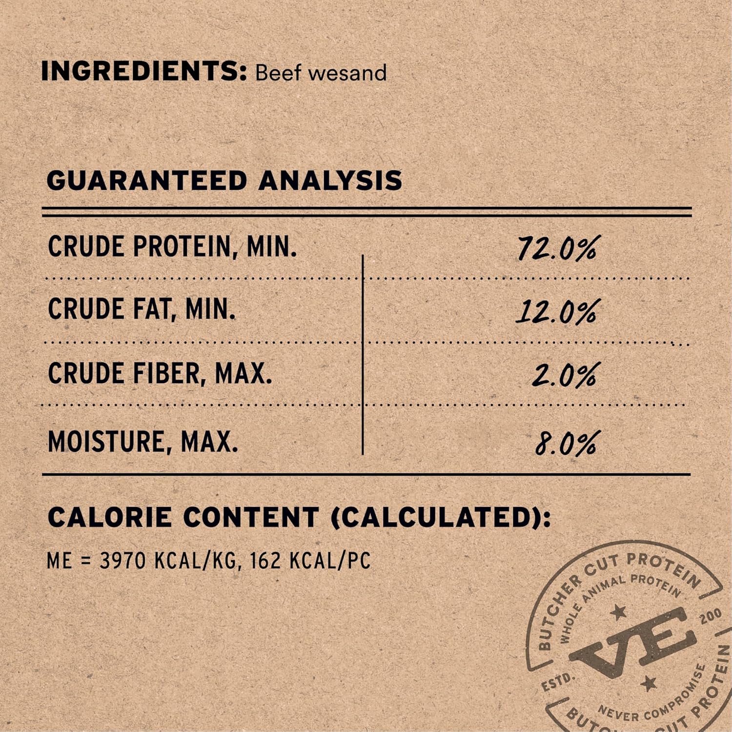 What exactly are moo sticks? They're premium beef weasand—the trachea that delivers a satisfying crunch and semi-firm inside ideal for medium to light chewers. Beyond supporting your dog's natural chewing instincts, these treats are rich in hydroxyproline, a vital component in collagen and cartilage to promote healthy joint function. Keep your pet naturally occupied with our Freeze-Dried Raw Bar Moo Sticks. Vital Essentials Freeze-Dried Raw Bar Dog Treats are a natural, nutrient-dense alternative to cooked hides and harsh dental chews. They provide essential mental stimulation while naturally cleaning teeth and delivering raw Butcher Cut Protein benefits. Support your dog's vitality with enriching whole animal parts that spark curiosity and excitement. Easy to serve and available in various textures and sizes to satisfy all types of chewers, regardless of your dog's shape or size. CALORIE CONTENT: ME = 3970 kcal/kg | ME = 162 kcal/pc. GUARANTEED ANALYSIS: Crude Fiber, max: 2% | Crude Fat, min: 12% | Crude Protein, min: 72% | Moisture, max: 8%. PREPARATION & STORAGE: This product is intended for intermittent or supplemental feeding only. Treats should not make up more than 10% of your dog’s daily calorie intake. Choose the most appropriate size treat for your pet and their chewing habits. Feed in moderation under supervision. Always provide access to clean, fresh water. Keep freeze-dried products sealed and stored in a cool, dry dark place. Keep out of reach of young children and pets. Not for human consumption. Best if fed within 30 days after opening.