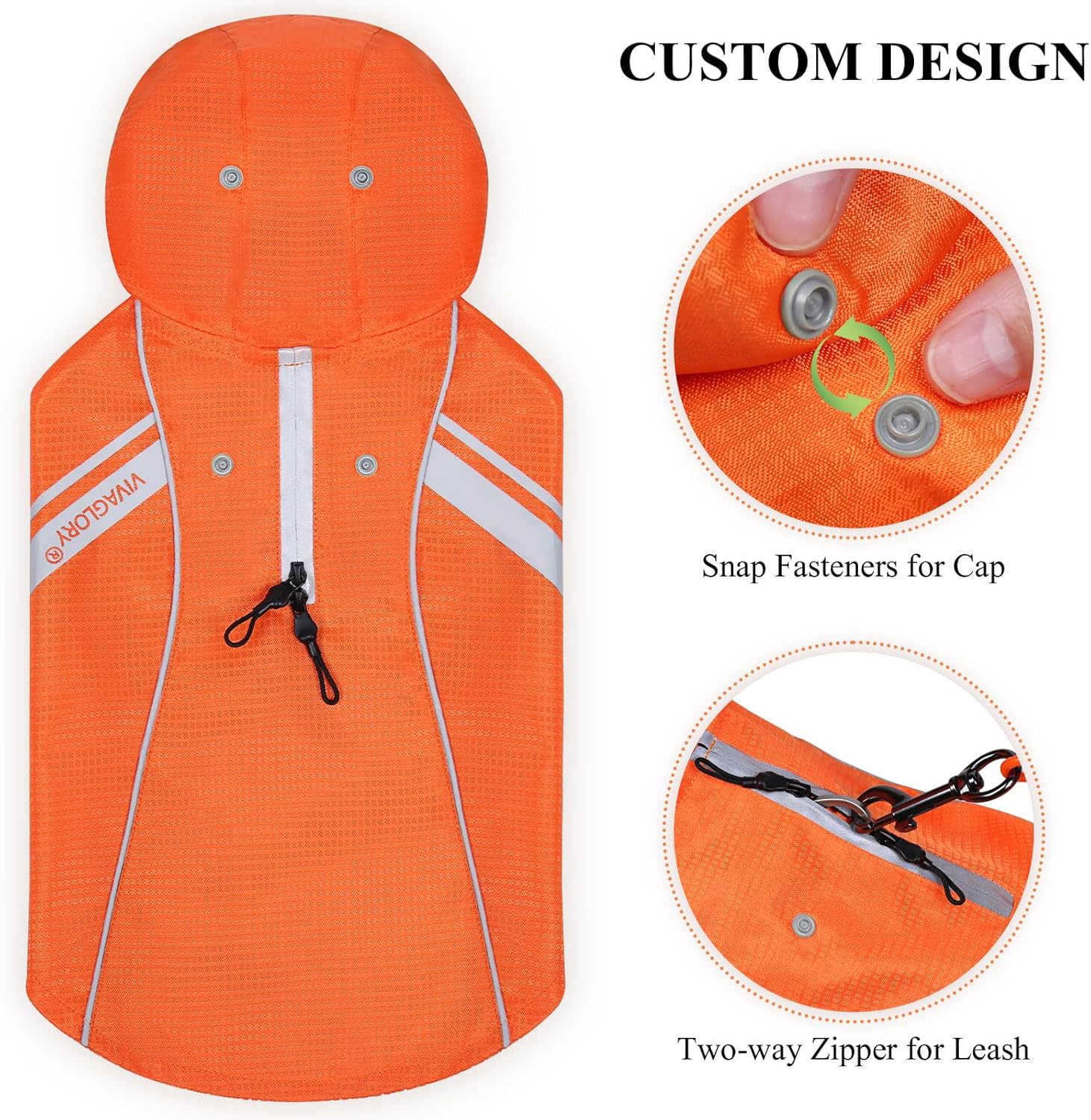 About this item 【WATER-REPELLENT】This water- repellent raincoat shields our fur friends from rain, make the rain bead off dog’s back, keep them comfortable in all weather conditions. You can still adventure with your fur friends even in the rainy or snowy days, just need one towel to wrap extra water when you back home. 【CUSTOM DESIGN】Made of 100% polyester material with breathable inner lining, lightweight & comfortable & durable for long time use. The professional elastic adjustment cap buckle to adjust the size of cap to protect the dog’s head better and closely. The cap can be folded back with snap buttons if rain or snow stop. Buy one dog coat, act as a wind coat, raincoat, pet safety vest, light-weight dog jacket. 【MUCH SAFER】Wider reflective trims and highly visible bright color increase visibility and add safety during your walks in low light condition. Two-way zipper leash hole with cover flap allows for easy access to a collar or harness, but also prevents the zipper from touching our dog’s body, give them gentle caring. Multiple safety guarantees. 【CONVENIENT】Adjustable belly strap allows for a snug fit on most dogs, easy on & off, just secure the magic sticks around neck and belly part. Easy to clean, handwash or machine wash is available. It' easy on and off when you back from trips to the park, beach, or hiking trails and camping. No more worries about it. 【MATCHING COLORS】The lightweight sporty dog rain coat doesn’t restrict your dog’s movement while walking. Works well with VIVAGLORY dog leashes; and matching colors are available. Please measure the CHEST GIRTH and BACK LENGTH and check the size in our size chart before order, any size problem you need, please feel free contact. › See more product details
