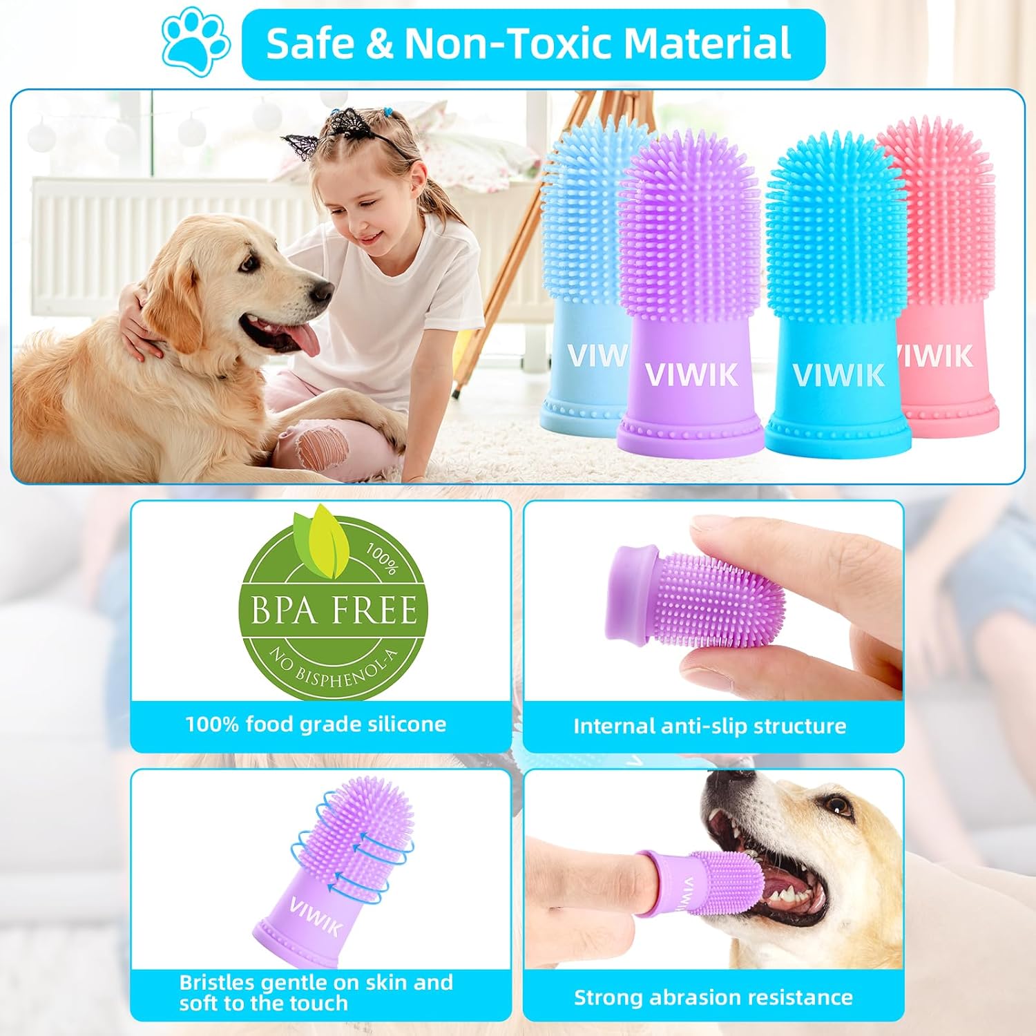 About this item Maintain Your Pet's Dental Hygiene for Better Oral Health: An essential toolkit for maintaining your pet's dental hygiene! With four high-quality toothbrushes in every pack, you can keep your furry friend's teeth sparkling clean. Each toothbrush features soft bristles that are gentle on your pet's gums, making the brushing experience more comfortable and enjoyable for your pet Safe for Pet: Made from high-quality silicone, our toothbrushes are completely safe for pets and are BPA-free. With soft bristles that are gentle on your pet's gums, our toothbrushes make it easy to maintain your pet's oral hygiene. They are also designed to reach even the most difficult areas, ensuring that your pet's teeth are thoroughly cleaned. Plus, our Dog Toothbrush is reusable and easy to clean, making it an eco-friendly choice for pet owners Unique Color & Easy to Use: The cat finger toothbrush kit includes 4 different colors that are designed to capture your furry friend's attention and make brushing their teeth an enjoyable experience. The finger sleeves can easily fit onto any finger size when you add a little bit of water inside them. It's a perfect Christmas Gifts for Dogs&Cats Wide Applicability: This dog toothbrush kit can be used on various types of pets. It is especially suitable for different dog breeds, including medium-sized and large breeds. (Need to be used with toothpaste) After use, cleaning is a breeze, and you can conveniently store the toothbrushes in the included storage box. This toothbrush set is not only practical but also stylish, adding a splash of color to your pet's dental hygiene routine Lightweight & Easy to Carry: This pet toothbrush is lightweight and compact, making it incredibly convenient to carry with you wherever you go. It can fit easily in your pocket, purse, or travel bag, so your pet never has to miss out on their dental hygiene routine, whether you're at home or on the go › See more product details