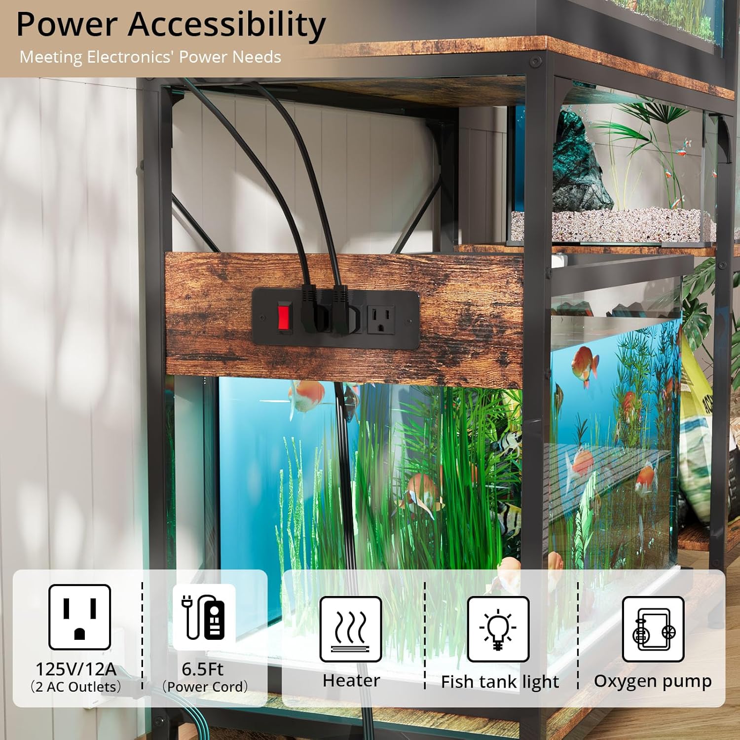 About this item Useful Power Outlets: The 29 gallon fish tank stand comes integrated with 3 AC power outlets, which provides convenience for heater rods, filters, LED lights, and other devices, avoiding cluttered wires, and simplifying your fish tank management Double Tank Stand: Our stand features a two-tiered structure. With a desktop size of 31.5"L*15.7" W, it can accommodate 10-29-gallon aquariums both on the top and bottom. It can easily support most standard-sized fish tanks Multi-layer Storage: The side 3 layers storage shelves provide ample storage space for fish accessories, plants, books, and more decos. More flexibility for your storage Reversible Design: The reversible design allows you to install the side shelves on the left or right side according to your needs, which is more considerate Sturdy Construction: Designed with six legs and X-shape support, the heavy-duty stand ensures up to 500 pounds. Equipped with adjustable feet, it can remain stable even on uneven ground Easy Assembly: The package includes instructions and all the tools needed for assembly and all parts and accessories are labelled, just enjoy hassle-free assembling this stand › See more product details