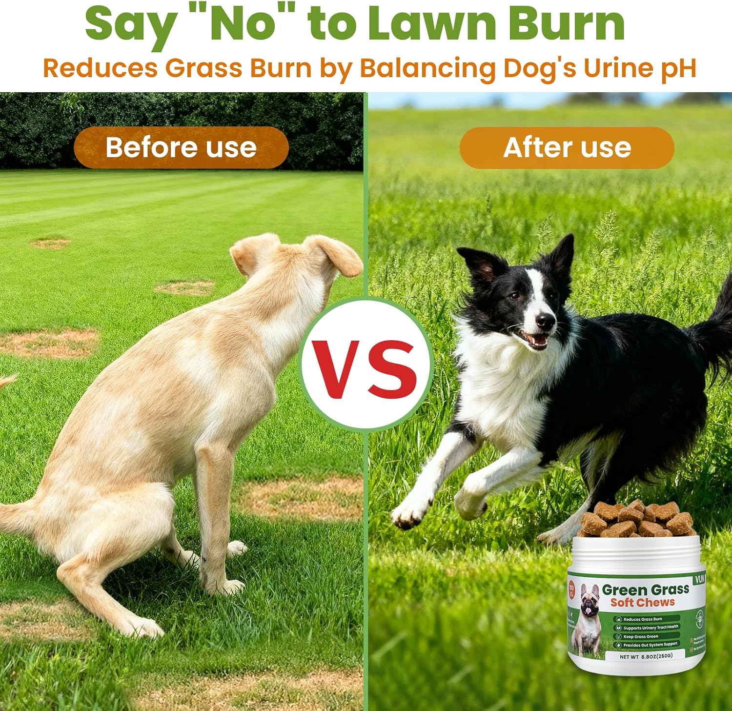 About this item Lawn Saver & Grass Protection: Protect your lawn from yellow burn spots with our Green Grass Dog Chews, a natural dog urine neutralizer for lawn. Formulated with DL-Methionine to reduce nitrogen levels, these chews act as powerful grass savers for dog urine, keeping your yard lush, vibrant, and spot-free. Urinary & Bladder Health Support: More than just a lawn care solution – our grass burn spot chews for dogs promote healthy bladder and urinary tract function. Infused with cranberry and apple cider vinegar, they help balance urine pH and provide long-term urinary tract support for dogs of all breeds and ages. Digestive & Gut Wellness:Each chew combines probiotics and digestive enzymes to improve nutrient absorption, aid digestion, and strengthen gut microbiome health. Unlike sprays and tablets, our dog pee grass neutralizer chews are an easy-to-digest solution that supports both digestive and immune health. Natural, Tasty & Safe for All Dogs: Crafted with premium, natural ingredients and free from grains, sugar, or artificial preservatives, our green lawn chews for dogs are safe for daily use. The delicious chicken flavor makes them irresistible to picky eaters, turning lawn protection into a treat dogs love. Made by Vet Formulated Quality: Proudly made in a GMP-certified facility, our urine neutralizer grass saver soft chews are veterinarian formulated for maximum safety and effectiveness. Give your pup daily lawn saver dog chews and enjoy a greener lawn, improved urinary health, and lasting peace of mind. › See more product details