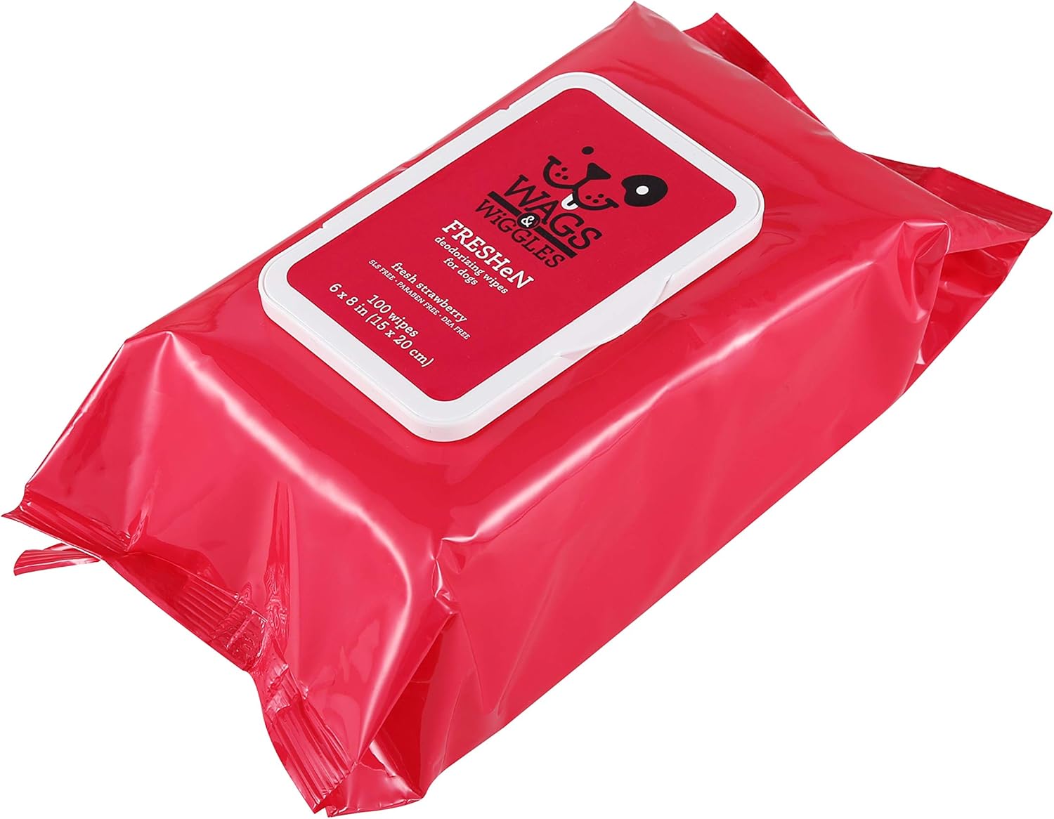 Dirty dog? The mild cleansers in Wags & Wiggles polish multipurpose wipes for dogs deodorize, freshen, and clean without irritating pups' sensitive skin. These dog wipes condition, soothe, and bring your dog a shiny coat by using high quality aloe vera. The convenient size of these dog cleaning wipes makes them perfect for tossing into your doggie adventure bag when it's time to hit the dog park or the trail. When the messy fun is done, just rub your buddy down with a few of these refreshing dog wipes and he'll be ready for more civilized occasions. Use multipurpose dog cleaning wipes to clean dog paws or clean dog coats after play time. Get your buddy nice and clean with Wags & Wiggles dog wipes. Formulated to be gentle on sensitive skin, these cleansing cloths are infused with aloe, oatmeal, and cucumber to keep your pup’s coat nourished, moisturized, and tangle free. One whiff of the delicious Fresh Strawberries scent and your dog will be wagging his way to another bath! Bring the entire pack when you travel with the Wags & Wiggles Pet Dog Deodorizing Wipes. These gentle grooming wipes are free of parabens, SLS, and other harmful ingredients, using oatmeal, aloe vera, and cucumber to clean your dog’s coat without irritation. They also help to condition your dog’s fur and skin with a fresh scent. These wipes are ideal if your pup tends to get into stinky or dirty situations that require a little extra TLC. DIRECTIONS: Gently wipe your pet with wipes for dogs from ears to back of tail avoiding eyes.