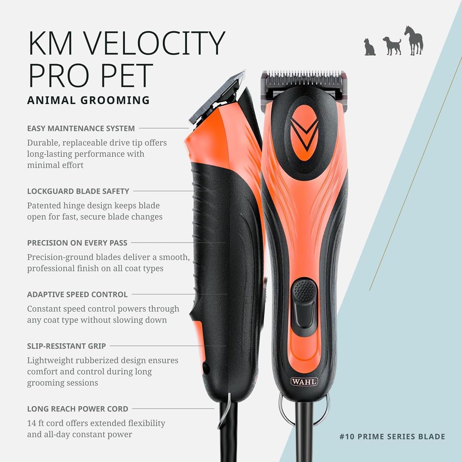 About this item Dog, Cat & Horse Clippers: Wahl Pro Animal KM Velocity provides corded, all-day grooming on dogs, cats, and horses and handles full body clipping on all coat types Detachable Blades: This versatile pet clipper is designed with LOCKGUARD technology to prevent the hinge from closing so you can switch blades with ease High-Quality Clippers: Our pet hair clippers are made with premium quality high-carbon steel for long-lasting durability and simple maintenance No-Slip Grip: Lightweight, slip-resistant rubber grip design for complete control and all day comfort Over 100 Years of Wahl Clipper: Built on the foundation of family values and integrity, Wahl aims to create precision tools that professionals can trust to inspire and deliver unparalleled results › See more product details