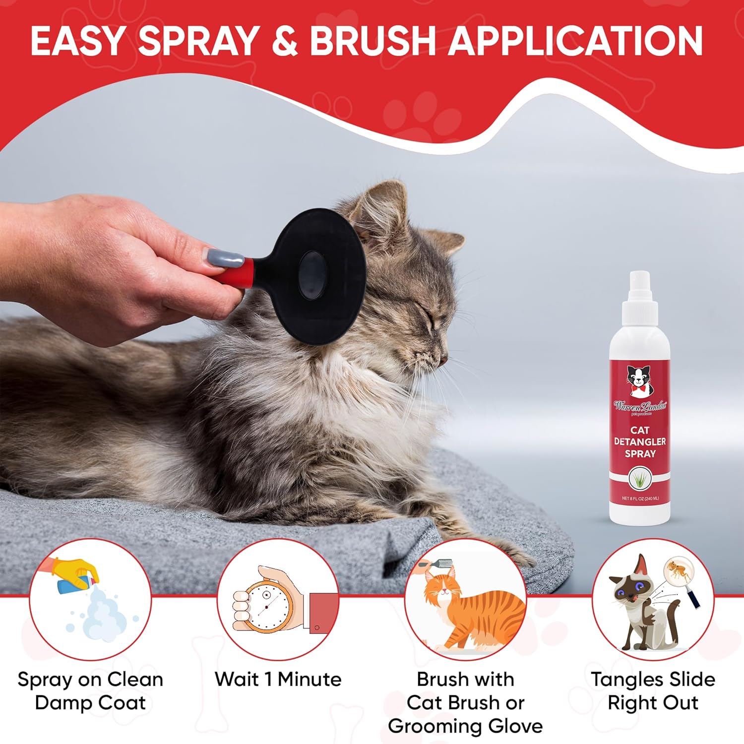 About this item Cat Conditioner Spray specially formulated to assist with mat removal and cat detangling. Fragrance Free - No artificial fragrances which is great for felines. This cat demat spray and cat fur detangler will leave behind no smelly odors and you brush out tangles. Easy To Apply - Spray the cat dematting spray onto clean damp coat and let sit for a minute. Gently pull matted areas with any cat brush or pet grooming glove. Professionally Formulated By Groomers - Use with common dematting tools for cats coat including specialty accessories like cat brushes for shedding Naturally Based Formula using Aloe Vera, Jojoba Oil, and Mineral Oil - Free from Detergents, Alcohol, and Parabens - Made in USA › See more product details