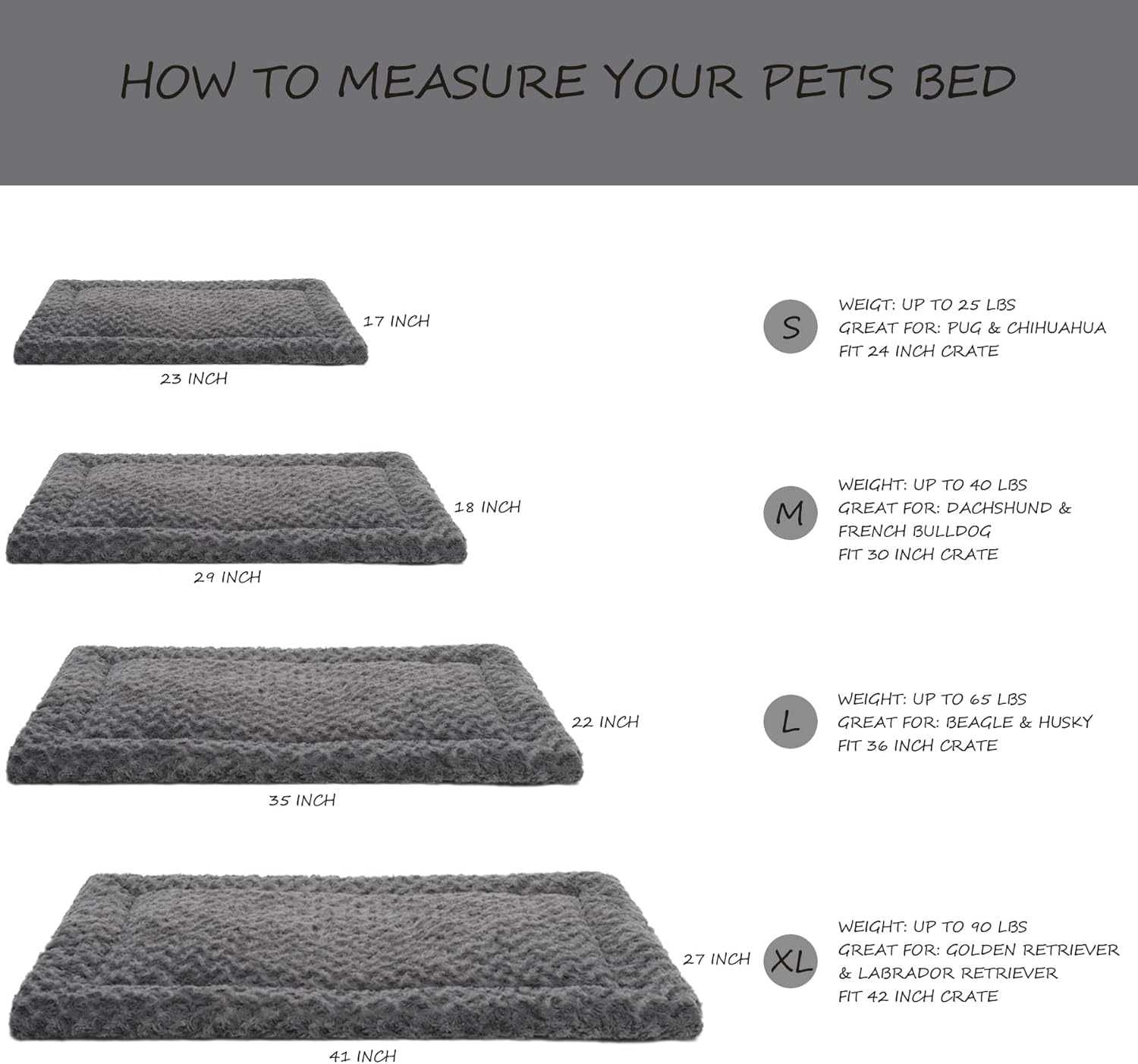 About this item Ultimate Sleep Surface - Our dog bed adopts 300gsm deluxe plush which is skin friendly, comfortable and not easy to shedding, full stuffing to ensure your little furry friend surrounded by love & warmth, helps them to calm down faster, ease anxiety, and sleep well. Universal for All Seasons - In the summer the dogs will be so afraid of the heat that they won't be able to use too thick pads, but our dog crate bed have a moderate thickness, both a certain degree of support, and the dog will not feel hot and stuffy lying on the mat. Four seasons universal, all year round this one mat is enough to use! Machine Washable - Our crate bed can be fully washed by washing machine and can remain shape after times wash. Let your puppy enjoy a breathable, clean and hygienic kennel bed. Size Details - XL size measures approximately 41"L x 27"W x 1-1/2"H, works great as large dog bed mats for dog up to 90 pounds. An excellent choice if you want a softer pad for your pet which is not too thick. Smart Design - Rectangle shaped dog mattress is perfect for your pets to sleep and roomy enough to stretch out. It also can be placed on any elevated dog bed & dog bed trampoline or in a crate & pet house. Care Tips: If the filling becomes lumpy or uneven after washing, ensure the dog crate pad is completely dry (air-dried or machine-dried). Once dry, firmly beat the bed and gently knead the filling several times. This process will help redistribute the filling and restore the pad's flat, comfortable shape. › See more product details