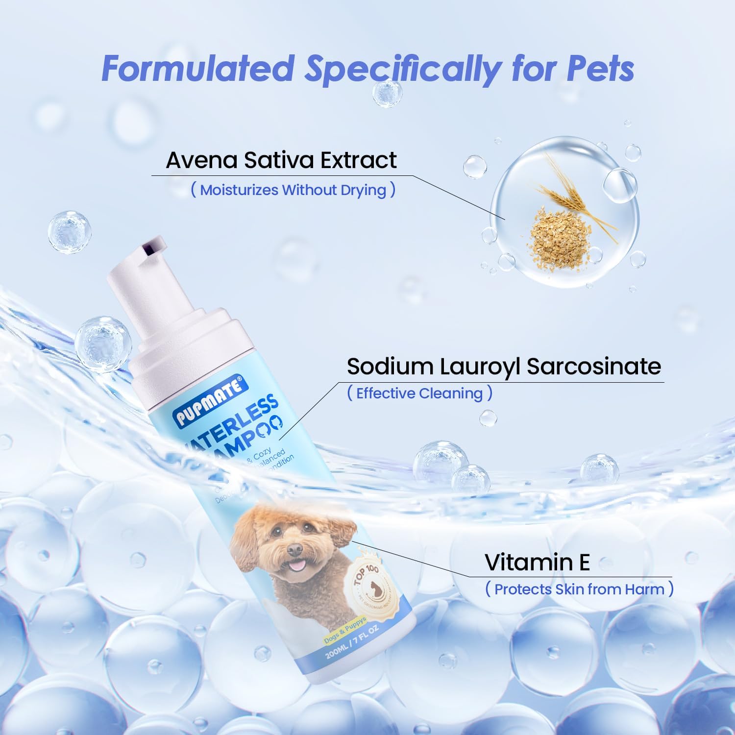 About this item Waterless & No Rinse Dog Shampoo for Easy Bathing: Quick, mess-free cleaning for dogs that hate baths. This no rinse waterless dog shampoo foam removes dirt, odor, and debris between baths — perfect for travel, rainy days, or post-walk touch-ups. Hypoallergenic & pH-Balanced for Sensitive Skin: Gentle, soap-free formula designed for sensitive skin. This hypoallergenic dog shampoo cleans without stripping natural oils, helping prevent dryness, itching, and irritation. Deodorizing & Conditioning in One Step: Neutralizes smelly dog odors at the source while conditioning fur for a soft, shiny, tangle-free coat. Ideal deodorizing dog shampoo for keeping pets fresh and cuddle-ready. Includes Soft Natural Bristle Brush: Comes with a boar bristle brush to evenly distribute shampoo, gently lift dirt, and stimulate skin circulation. Makes grooming relaxing and effective for your pet. Safe for Puppies, Senior Dogs & Cats: Versatile and pet-safe formula suitable for all breeds and ages — from playful puppies to older pets. Also works as a waterless cat shampoo for multi-pet households. › See more product details