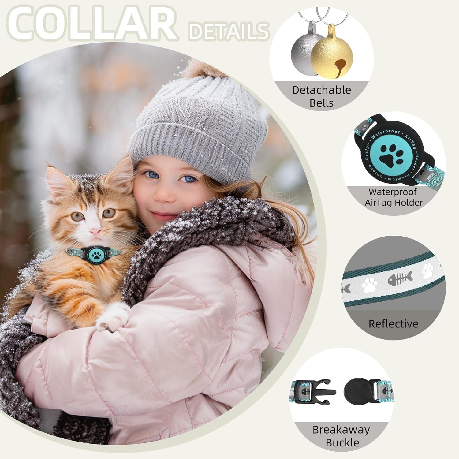 About this item Attach an AirTag effortlessly with the built-in cat collar airtag holder. Know exactly where your cat is, saving you from endless "where did they go?" moments. (AirTag is not included) Designed for safety, the breakaway buckle releases under pressure, preventing accidents while your curious cat roams. No worries about snagging on trees or furniture! Your cat will love the comfort of this air tag cat collar! Soft yet durable, it’s gentle on fur and skin, making it ideal for daily wear, whether they’re napping or chasing toys. No more guessing collar sizes! This adjustable airtag collar comfortably fits any cat, ensuring a snug and secure fit. Easy to adjust as your kitty grows or gains fluff. Keep your cat safe during nighttime escapades with a highly reflective airtag cat collar that’s easy to spot in low light. Your feline friend stays visible, giving you peace of mind while they explore. › See more product details