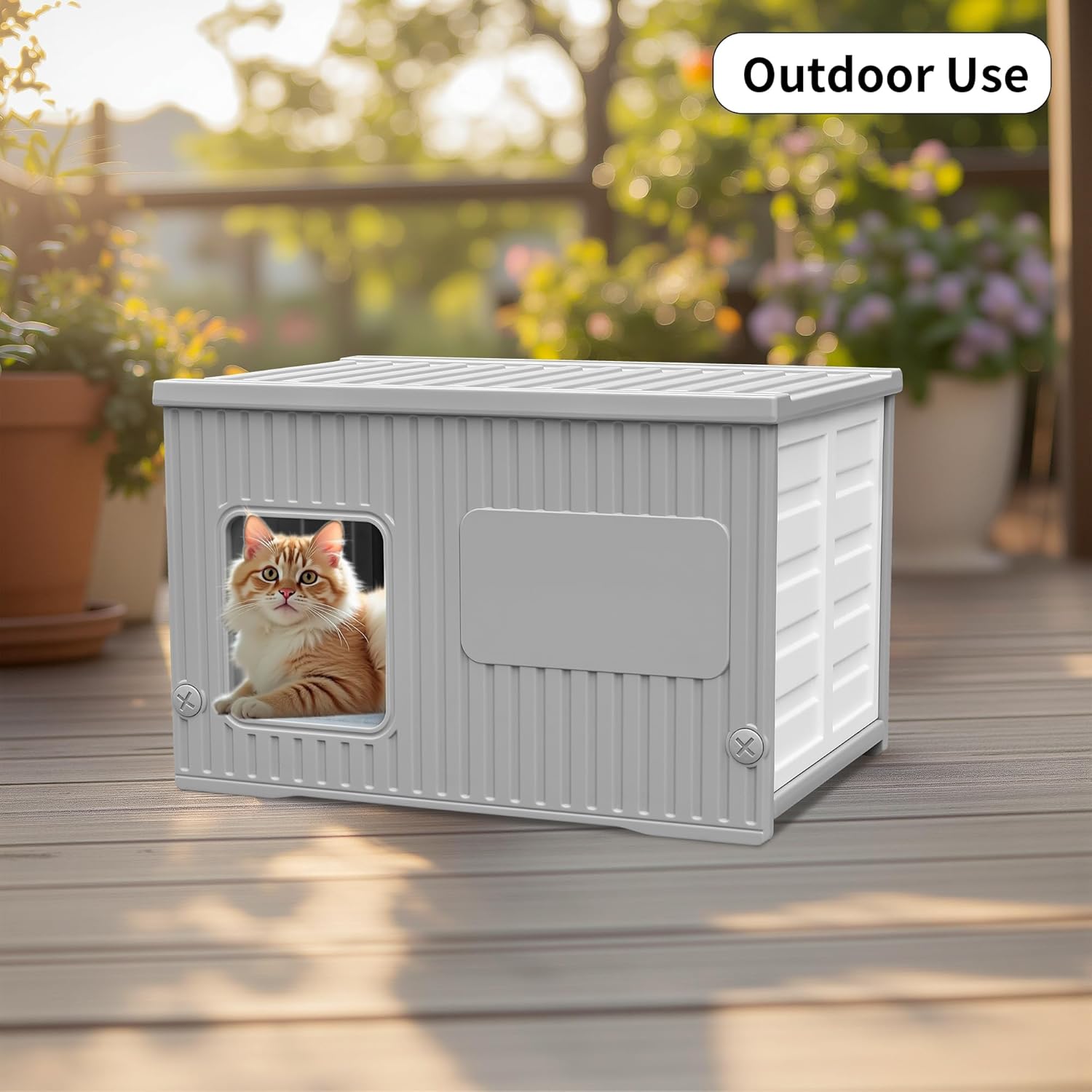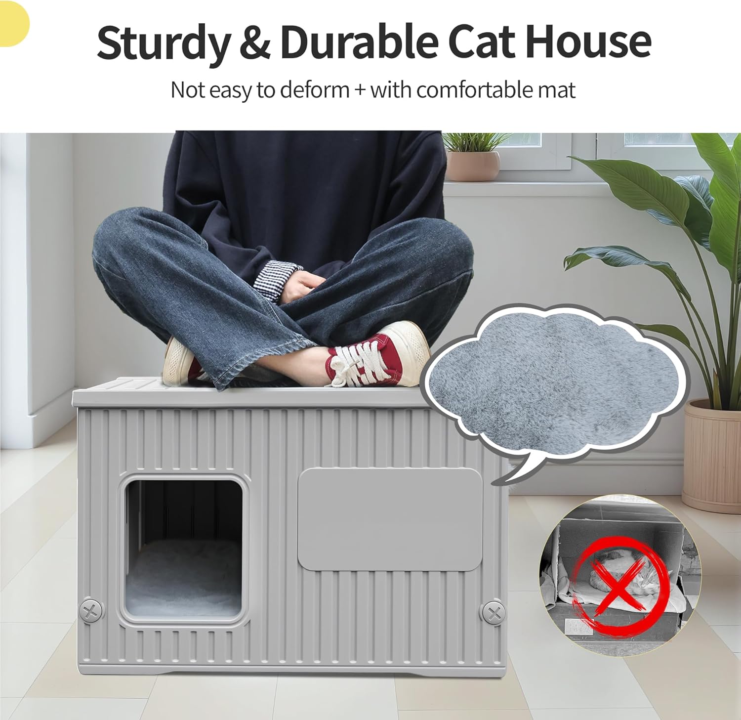 About this item Plastic cat house dimensions: 22.2"L x 15.4"W x 14.3"H, enough space for 1-2 cats Can be Stacked: The top and bottom patterns are perfectly match. If there are 2 or more cats in your home, You can consider buying more cat houses and stacked them as a Multi-story cat house to save you space Warm Outdoor Cat Bed Mat: the bed mat is made from ultra-soft fluffy fabric, which creates a warm sleeping surface for pets to curl up in cozy comfort Thickened Double-layer: Each wall of this outdoor cat house has a thickened double-layer design, the bottom is elevated with a sturdy stand, Three sides are sealed (except for the entrance), suitable for both indoor and outdoor. Easy to Assemble: Outdoor cat house for feral cats equipped with instructions, you just need to install it according to the steps. It can be completed in less than five minutes. Once correctly assembled, the stable structure will never split or fall apart Easy To Clean: Our outdoor cat house is made from durable HDPE material, 100% waterproof outdoor cat house without worrying about bad weather. Additional tools can easily disassemble the cat house, which is convenient for daily maintenance and cleaning › See more product details