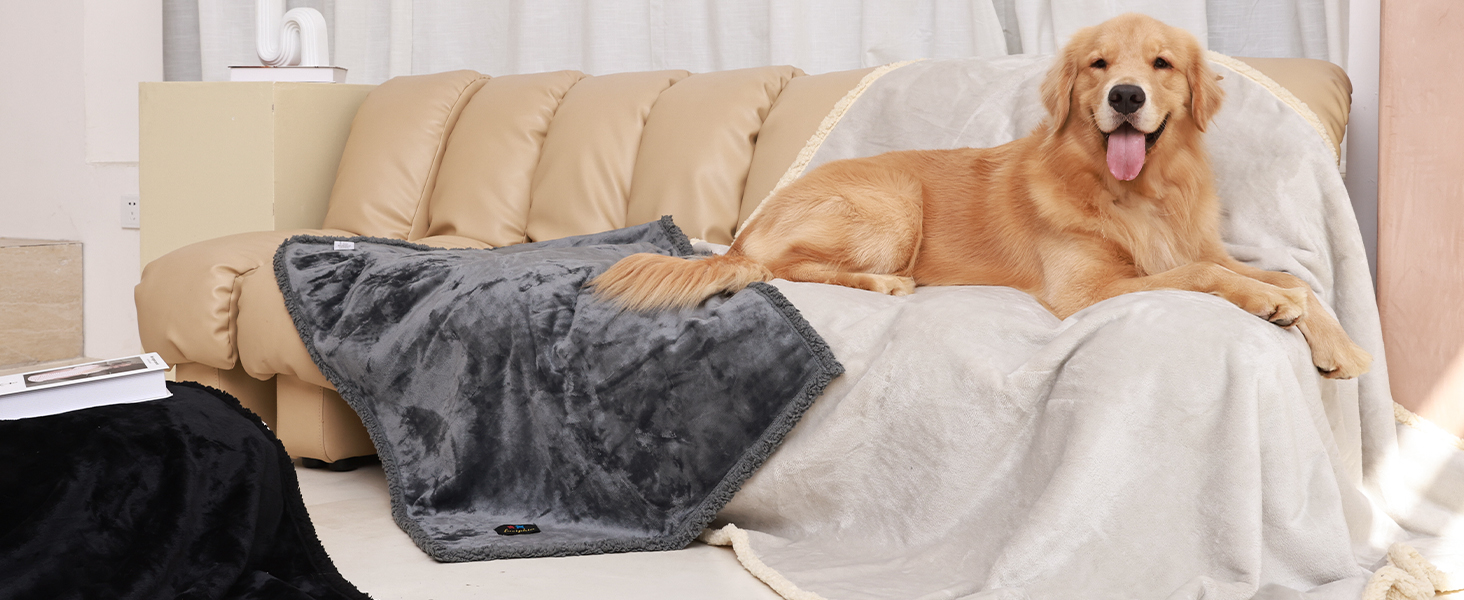About this item TRIPLE LAYERS DESIGN - Soft thick fleece on one side and plush sherpa backing on the other to keep your pets comfy, warm and dry. Internal waterproof lining provides defense and stops liquids from seeping through. NOTE: The surface of the fiber itself is not waterproof! PROTECT FURNITURE - Waterproof coating is applied inside the blanket.It will protect your furniture from stains and urine,which keeps your pet cozy and comfortable. Also great to help keep unwanted pet hair and fur from sofas and couches, chairs, beds, sheets, comforters, car seats. WARM AND COMFORTABLE - Thick and durable pet blanket made of layered warm Sherpa and soft fleece. No pilling, skin-friendly.Perfect for the couch or inside a pet carrier. Keep your pets warm and cozy to lounge and nap all year round. SIZE - Ideal for all types of furniture. Available in four sizes. Small: 40” x 28” (100cm x 71cm) / Medium: 57” x 40” (145cm x 100cm) / Large: 65” x 57” (165cm x 145cm)/ X-Large: 85” x 57” (216cm x 145cm). Perfect for small, medium, and large dogs, as well as cats and kittens. EASY TO CLEAN - Machine washable. Wash the blankets on a gentle cycle and regular detergent, do not dry in high heat. › See more product details