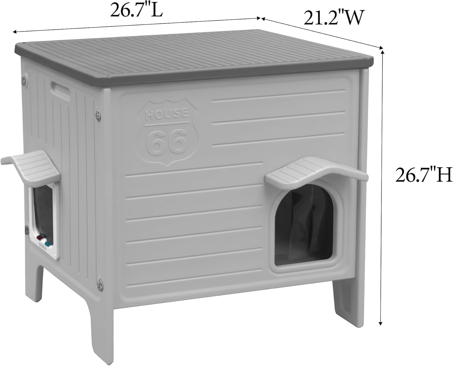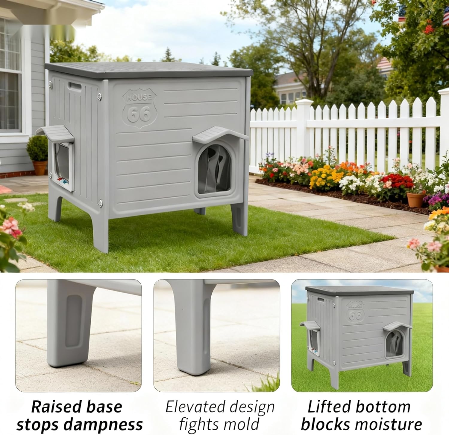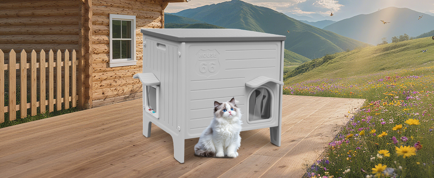 About this item Insulated Plastic Cat House: The double-layer plastic cat house traps a layer of air between its two plastic sheets—and air is a poor heat conductor. This air gap acts as a barrier: in winter, it slows down the loss of warmth inside the house, keeping the space cozy; in summer, it blocks external heat from seeping in, keeping the interior cool. That’s how it achieves both insulation and temperature retention. Easier to assemble than wooden ones: The plastic cat house feature snap-together designs, pre-drilled holes, and lightweight components that require no tools—just follow simple instructions for quick setup. Unlike wooden houses that may need screws, glue, or sanding, plastic versions save time and hassle, making them ideal for pet owners Ideal for outdoor use: due to their weather resistance, durability, and convenience. The waterproof material prevents rain damage, while UV-resistant plastics avoid sun fading. The elevated design keeps cats dry on damp ground, and the lightweight structure allows easy relocation. Unlike wood, plastic won’t rot, warp, or attract pests Easy Cleaning: Clean as a breeze! Our plastic cat house wipes clean in seconds—no stubborn stains, no lingering odors. Just a quick rinse with a hose, and it’s fresh and ready for your feline friend’s next adventure. Waterproof, odor-resistant, and built for hassle-free care!" Escape Door Design: the cat house with an escape door, It allows cats to quickly exit if threatened (e.g., by other animals or trapped heat), reducing stress and injury risks. The dual-entry design also improves ventilation and prevents territorial conflicts in multi-cat homes. For outdoor use, it’s a lifeline against predators › See more product details
