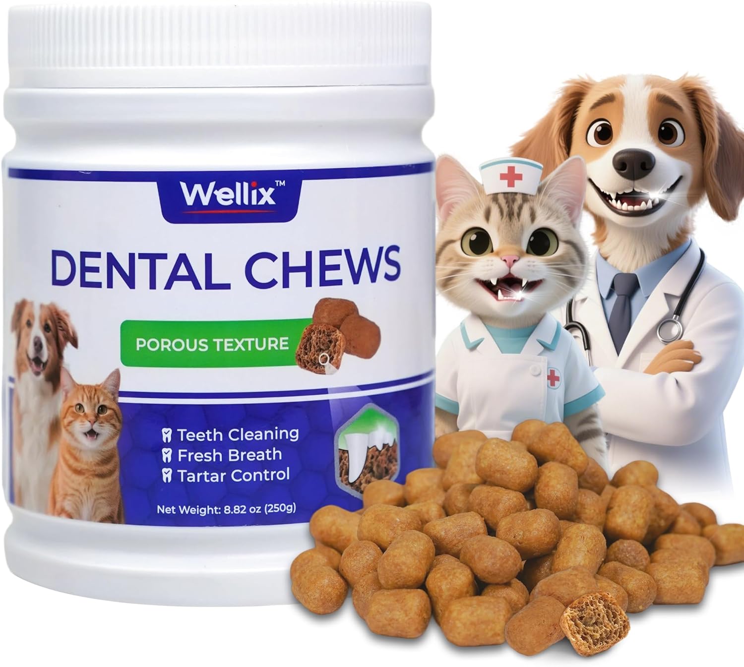 Pet Teeth Cleaning - Wellix cat dental chews feature a crunchy porous texture that gently brushes teeth while chewing treats. They work as a plaque remover and help tartar control for cats and dogs, promoting long-term oral health Natural Ingredients - Wellix dental chews for cats contains plant fiber, vitamins C/E, seaweed powder, and other nutrients. Each cat breath freshener treats uses natural ingredients to provide bad breath treatment and support tooth care Healthy Pet Treats - Wellix healthy cat treats are a safe, worry-free choice for daily oral care. This healthy mouth treats for dogs and cats is free of artificial flavors or colors Irresistible Taste - Wellix cat teeth cleaning treats are enhanced with chicken, even furry friends with sensitive stomachs and picky eaters can’t resist. Chewing action supports kitten dental care effectively —no brushing required Multi-Pet Family Preference - Wellix dental care treats are crafted with the ideal size for cats and small dogs teeth. Perfect as a cat food add ins or training treats for your furry friend in a fun, effortless way › See more product details