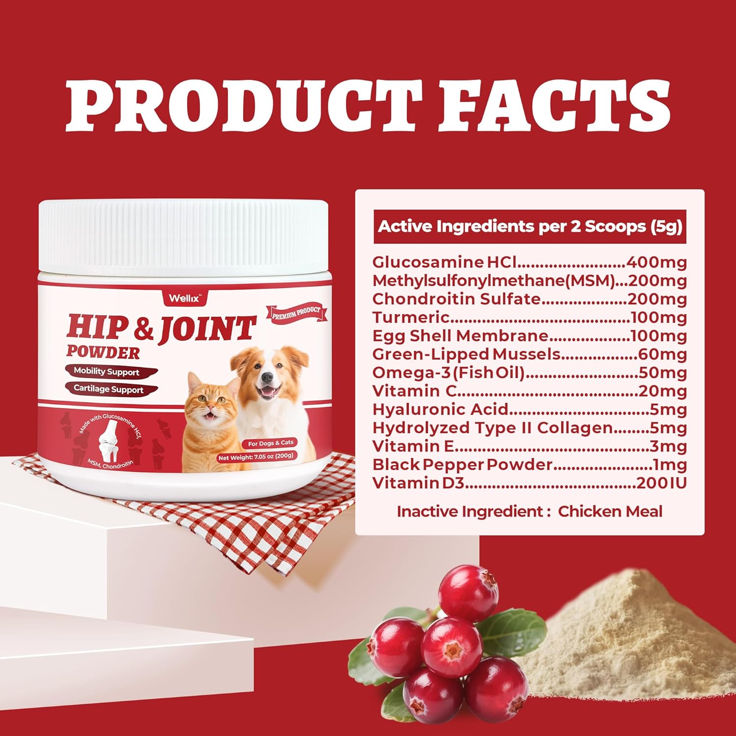 Advanced Ingredients - Formulated with glucosamine for dogs & cats, chondroitin derived from chicken, MSM powder, Wellix cat & dog hip and joint supplement supports cartilage repair, joint lubrication & mobility, anti inflammatory for dogs. An extend joint care for dogs & cats Hip & Joint Support for Dogs & Cats - The glucosamine powder for dogs & cats supports stiffness relief, cat & dog joint pain relief, flexibility & dog arthritis pain relief. Targeting hip and joint for dogs & cats, this joint supplements for dogs & cats is ideal for daily support Promotes Comfort, Mobility & Activity - With glucosamine chondroitin for dogs & cats and MSM for dogs & cats added, this dog & cat joint supplement helps reduce joint discomfort, improve movement & mobility. A great add on to arthritis relief for dogs For All Dogs & Cats - Perfect dog joint supplement large breed, small & medium dogs & cats. This is perfect as a senior dog joint supplement, daily support for active dogs & cats, & dogs & cats with early signs of joint issues, giving care to your cat & dog hip & joint Delicious & Easy Food Topper - Just sprinkle onto your pets daily food as a cat & dog food topper, even picky eaters will love this dog glucosamine and chondroitin supplement large dog as the glucosamine chondroitin powder added is portioned just right › See more product details