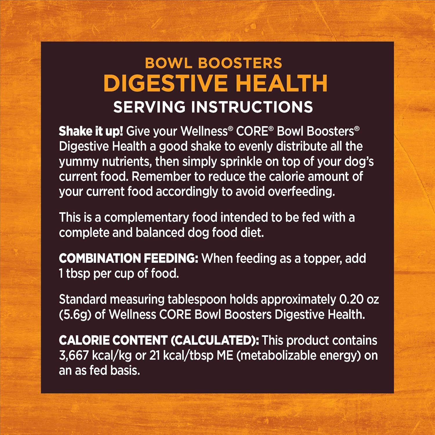 - Directions: This is a complementary food intended to be fed with a complete and balanced dog food diet. Combination Feeding When feeding as a topper, add 1 tbsp per cup of food. Standard measuring tablespoon holds approximately 0.20 oz (5.6g) of Wellness CORE Bowl Boosters Digestive Health.