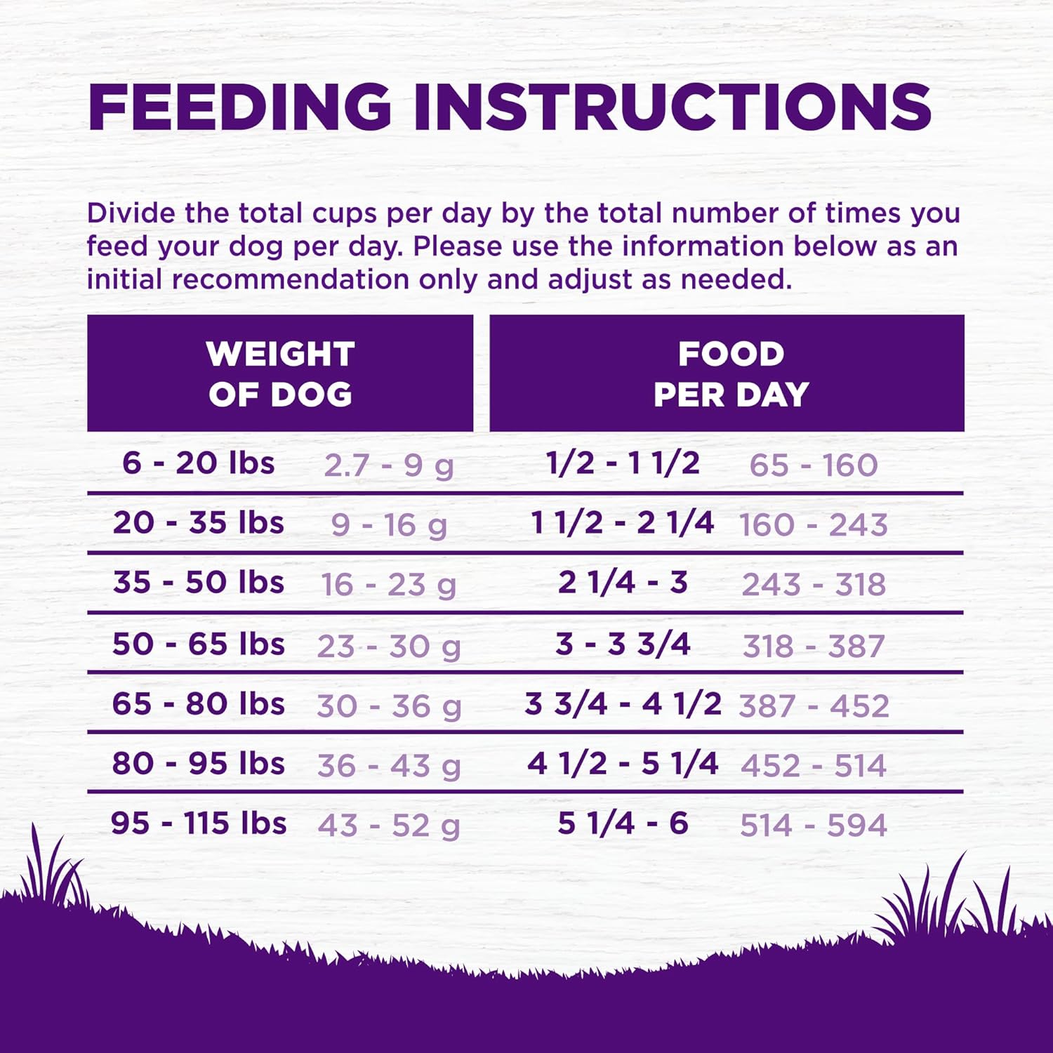 - Directions: "Standard measuring cup holds approximately 3.5 oz (98g) of Wellness Complete Health Sensitive Skin & Stomach Salmon & Rice Recipe Dog Food. " Weight of Dog (LBS) Weight of Dog (kg) Cups per Day Grams per Day 6 - 20 2.7 - 9 1/2 - 1 1/2 65 - 160 20 - 35 9 - 16 1 1/2 - 2 1/4 160 - 243 35 - 50 16 - 23 2 1/4 - 3 243 - 318 50 - 65 23 - 30 3 - 3 3/4 318 - 387 65 - 80 30 - 36 3 3/4 - 4 1/2 387 - 452 80 - 95 36 - 43 4 1/2 - 5 1/4 452 - 514 95 - 115 43 - 52 5 1/4 - 6 514 - 594 Dogs over 115 lbs (52kg) Add approximately 1/3 cup (36g) for every 10 lbs (4.5kg) over 115 lbs. Combination Feeding If feeding with Wellness wet food, reduce dry amount fed by 1/2 cup (49g) for every 6 oz (170g) of wet food.