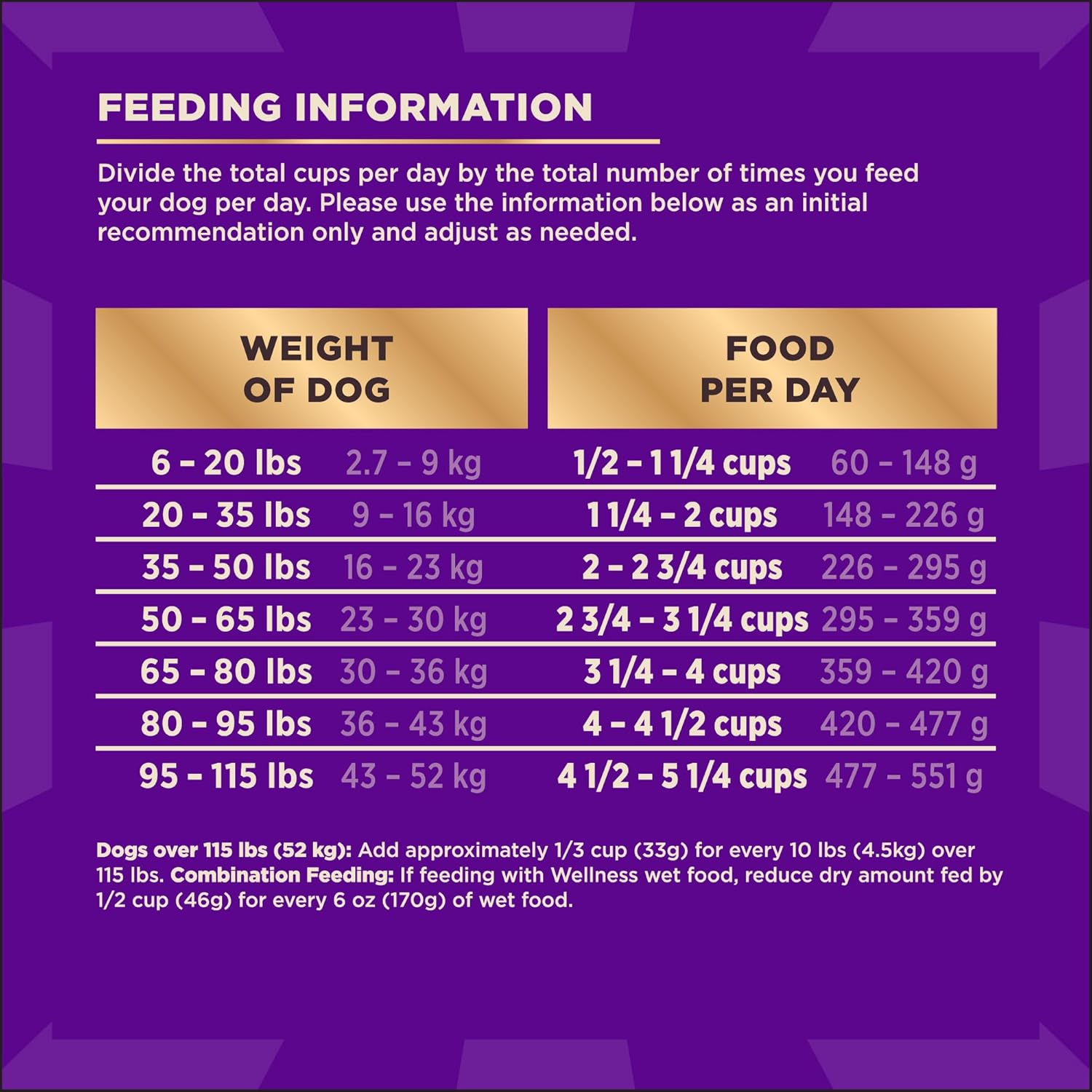 - Directions: WEIGHT OF DOG (LBS) WEIGHT OF DOG (KG) CUPS PER DAY GRAMS/DAY 6 - 20 2.8 – 9 ½ - 1⅓ 63 - 154 20 - 35 9 – 16 1⅓ - 2¼ 154 - 235 35 - 50 16 – 23 2¼ - 2¾ 235 - 307 50 - 65 23 – 30 2¾ - 3½ 307 - 373 65 - 80 30 – 36 3½ - 4 373 - 436 80 - 95 36 – 43 4 - 4¾ 436 - 496 95 - 115 43 – 52 4¾ - 5½ 496 - 573 DOGS OVER 115 LBS (52 KG) Add ⅓ cup (35 g) per additional 10 lbs (4.5 kg). COMBINATION FEEDING If feeding with Wellness wet food, reduce dry amount fed by ⅓ cup (35 g) for every 6 oz (170 g) of wet food.