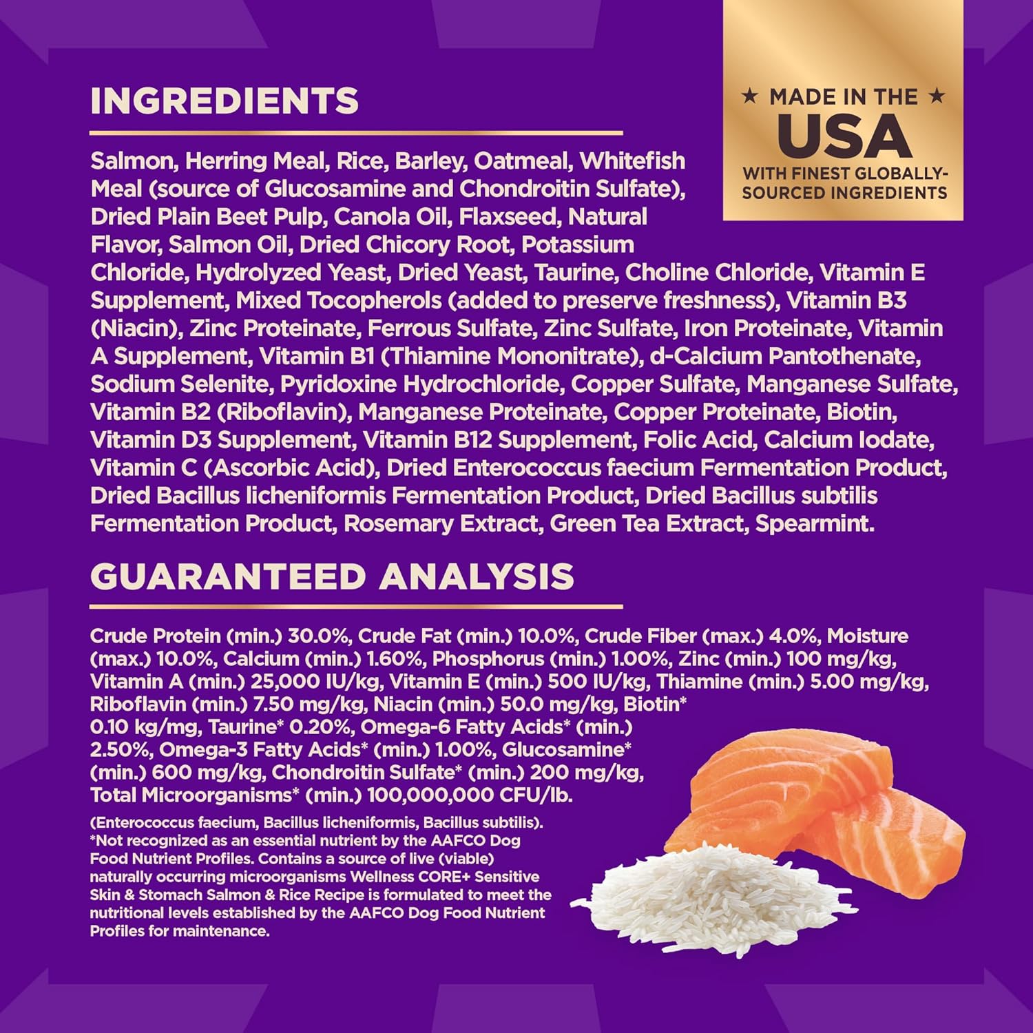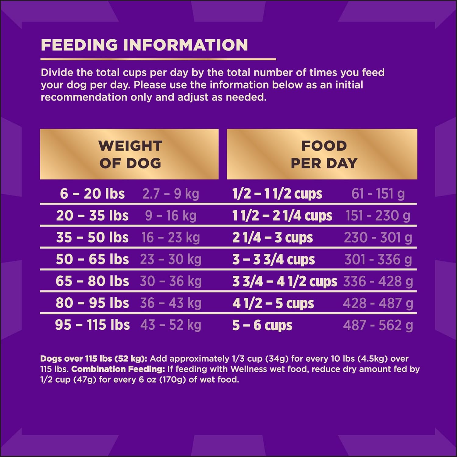 - Directions: Standard measuring cup holds approximately 3.5 oz (98g) of Wellness CORE+ Sensitive Skin & Stomach Salmon & Rice Recipe Dog Food. Weight of Dog (lbs) Weight of Dog (kg) Cups per Day Grams per Day 6 - 20 2.7 - 9 1/2 - 1 1/2 65 - 159 20 - 35 9 - 16 1 1/2 - 2 1/4 159 - 242 35 - 50 16 - 23 2 1/4 - 3 242 - 316 50 - 65 23 - 30 3 - 3 3/4 316 - 385 65 - 80 30 - 36 3 3/4 - 4 1/2 385 - 450 80 - 95 36 - 43 4 1/2 - 5 450 - 512 95 - 115 43 - 52 5 - 6 512 - 591 Dogs over 115 lbs (52kg) Add approximately 1/3 cup (36g) for every 10 lbs (4.5kg) over 115 lbs. Combination Feeding If feeding with Wellness wet food, reduce dry amount fed by 1/2 cup (49g) for every 6 oz (170g) of wet food.
