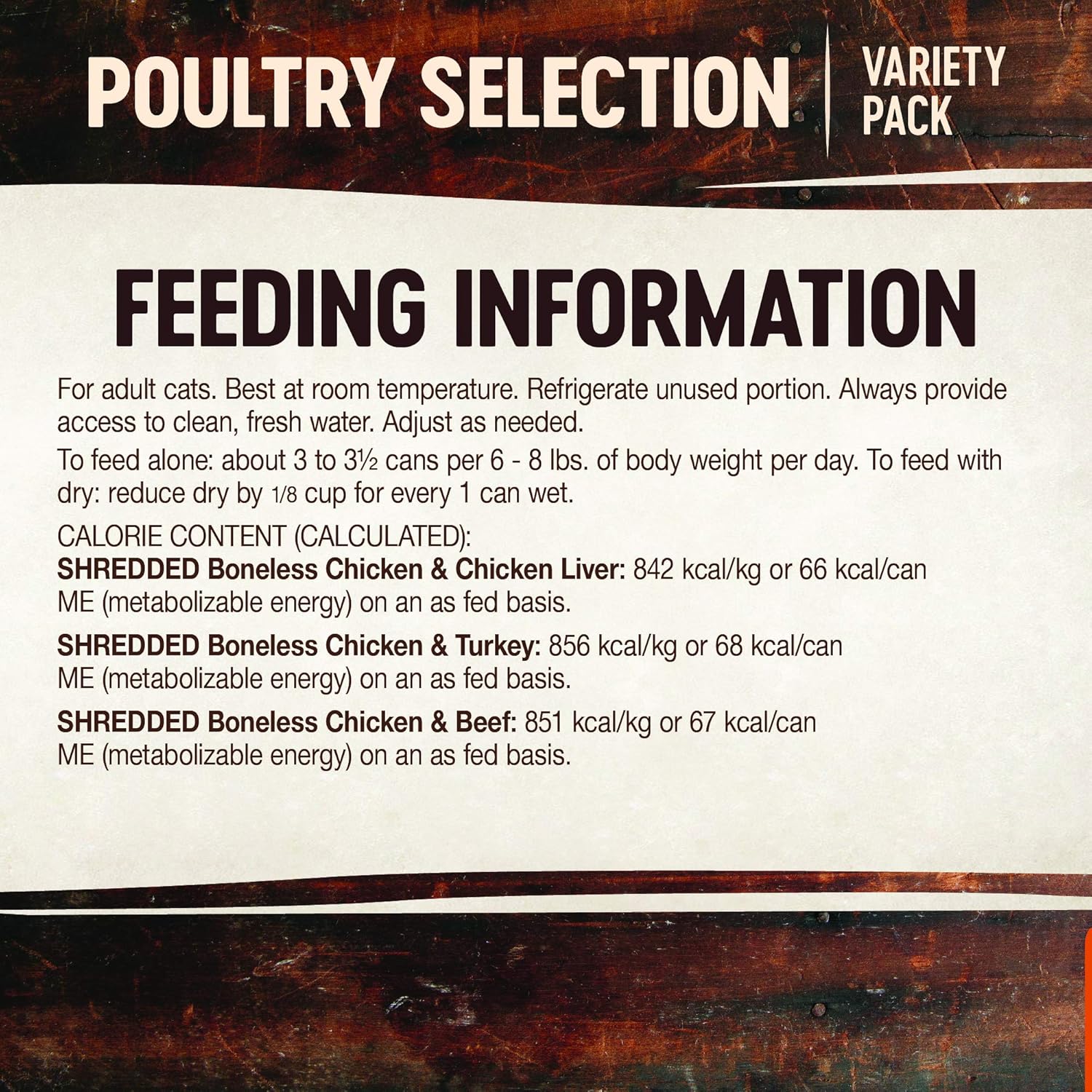 - Directions: For adult cats. Best at room temperature. Refrigerate unused portion. Always provide access to clean, fresh water. Adjust as needed. To feed alone about 3 to 3 1⁄2 cans per 6 – 8 lbs of body weight per day. To feed with dry reduce dry by 1/8 cup for every 1 can wet.