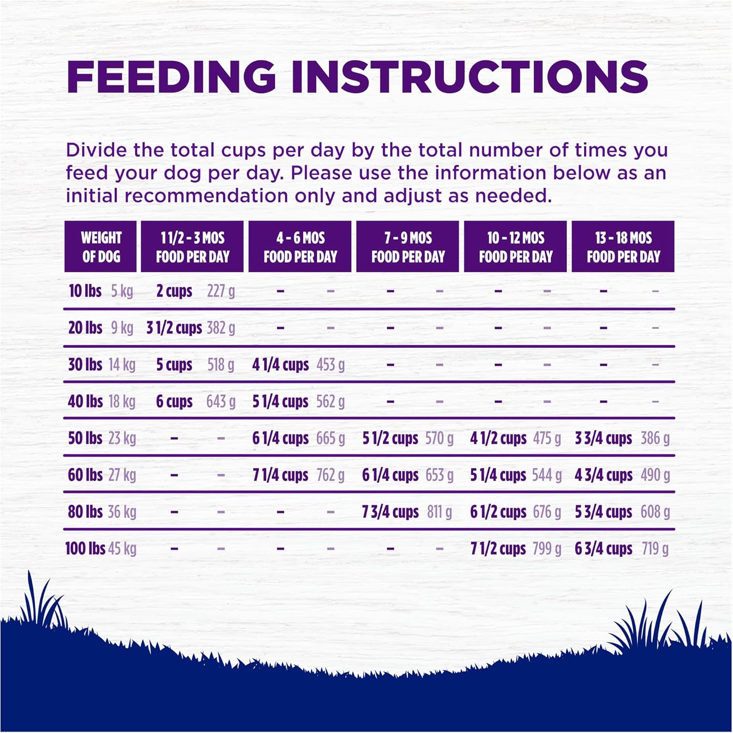 - Directions: WEIGHT (LBS) WEIGHT (KG) 6-11 WKS (CUPS/DAY) 6-11 WKS (GRAMS/DAY) 3-4 MOS (CUPS/DAY) 3-4 MOS (GRAMS/DAY) 5-7 MOS (CUPS/DAY) 5-7 MOS (GRAMS/DAY) 8-12 MOS (CUPS/DAY) 8-12 MOS (GRAMS/DAY) 10 4.6 2⅛ 221 2 208 1¾ 182 1¼ 130 20 9 3⅔ 381 3⅓ 346 3 312 2½ 260 30 14 5 520 4½ 468 4 416 3½ 364 40 18 6¼ 650 5¾ 598 5 520 4¼ 442 50 23 - - 6½ 676 6 624 5 520 60 27 - - 7½ 780 6¾ 702 5½ 572 80 36 - - - - 8 832 7 728 100 45 - - - - - - 8 832 Dogs over 100 lbs (45 kg) Add ¼ cup (26 g) per additional 10 lbs (4.5 kg). Combination Feeding If feeding with Wellness wet food, reduce dry amount by ¼ cup (26 g) for every 6 oz (170 g) of wet food. For pregnant or nursing dogs Since DHA is transferred to puppies in mother’s milk, we recommend feeding this during pregnancy and nursing. When pregnant, feed up to 50% more food according to body weight for 12 mos. For nursing dogs, allow her to eat at will. Every puppy is a little different, so optimal feeding amounts may vary with age, size, activity level, breed and environment. Please use feeding guidelines as an initial recommendation and adjust as needed. Calorie Content This food contains 3,533 kcal/kg or 367 kcal/cup ME (metabolizable energy) on an as fed basis.