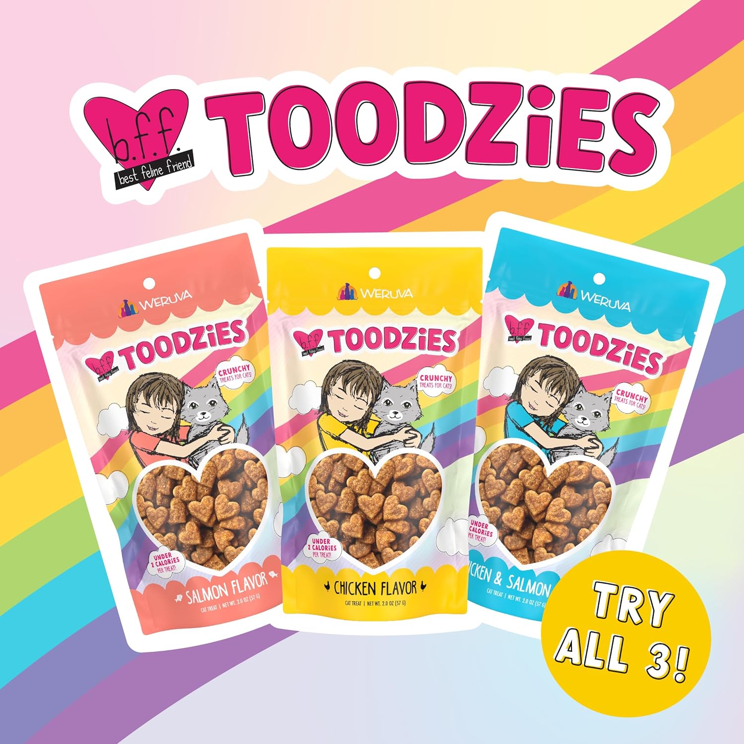 About this item The information below is per-pack only BFF Toodzies, Chicken Crunchy Cat Treats, 2oz Bag. Made with chicken, sweet potato, and pumpkin BFF Toodzies are crunchy cat treats are made with real meat like chicken and salmon. Less than two calories per treat Free of grains, gluten, carrageenan, wheat, corn, and soy. No artificial colors, flavors, preservatives, or animal by products BFF Toodzies Crunchy Cat Treats are intended for intermittent or supplemental feeding Weruva is a family company, wholly owned and operated by pet parents David and Stacie Forman › See more product details