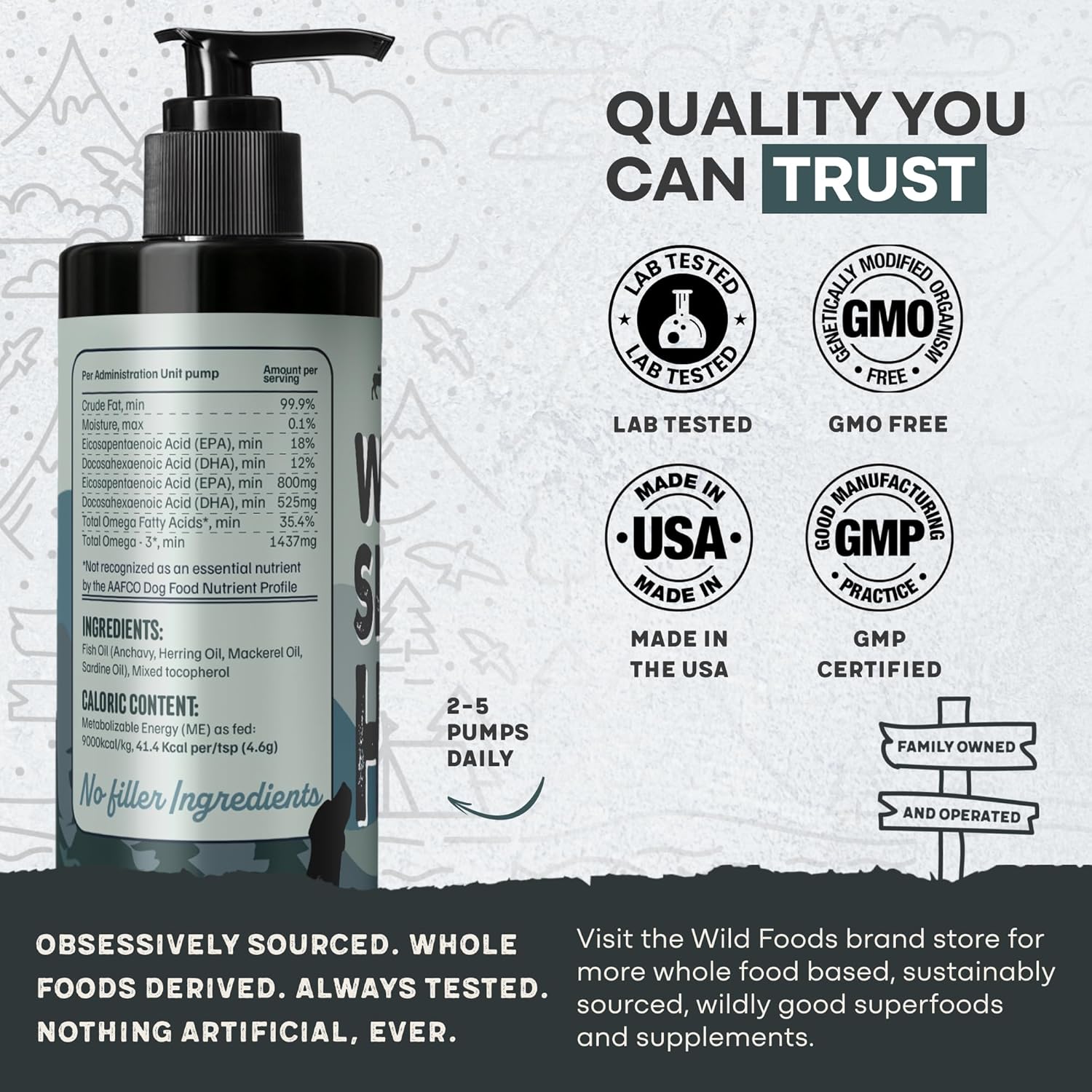 Wild Dogs Fish Oil is a premium liquid fish oil omega 3 supplement crafted to support your pet’s skin and coat health naturally. Each serving provides 1,437 mg of total Omega-3 fatty acids—including 800 mg EPA and 525 mg DHA—from clean sources such as anchovy, herring, mackerel, and sardine oils.This balanced formula is a powerful dog omega 3 supplement and an excellent choice for pet parents seeking a cleaner, more concentrated option than typical wild Alaskan salmon oil for dogs. It can also be used as a safe, gentle source of omega 3 for dogs and cat fish oil support for shiny coats and healthy skin.The high-purity blend provides a complete pet omega oil for dogs and cats that fits easily into mealtime. Simply pump over food for effortless use—ideal for multi-pet households that rely on trusted dog fish oil supplements or fish oil cats blends.As a natural dog skin and coat supplement, Wild Dogs Fish Oil helps maintain soft fur, normal shedding, and skin moisture. Pet owners also use it as part of a routine for dry skin relief for dogs and cats, offering a simple way to nourish the coat from within. This pure dog oil contains no fillers or artificial ingredients—just clean nutrition.Whether you’re shopping for omega dog nutrition or researching salmon oil cats and aceite de salmon para perros, Wild Dogs Fish Oil offers a balanced, high-EPA/DHA alternative that supports pets’ daily well-being.Ingredients: Fish Oil (Anchovy, Herring, Mackerel, Sardine), Mixed Tocopherols (Vitamin E). Crude Fat 99.9 %.