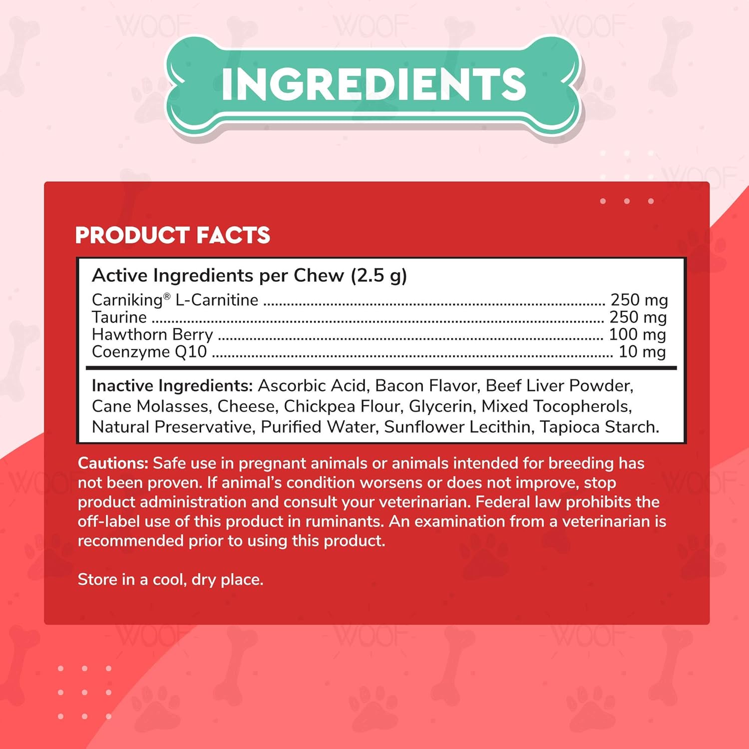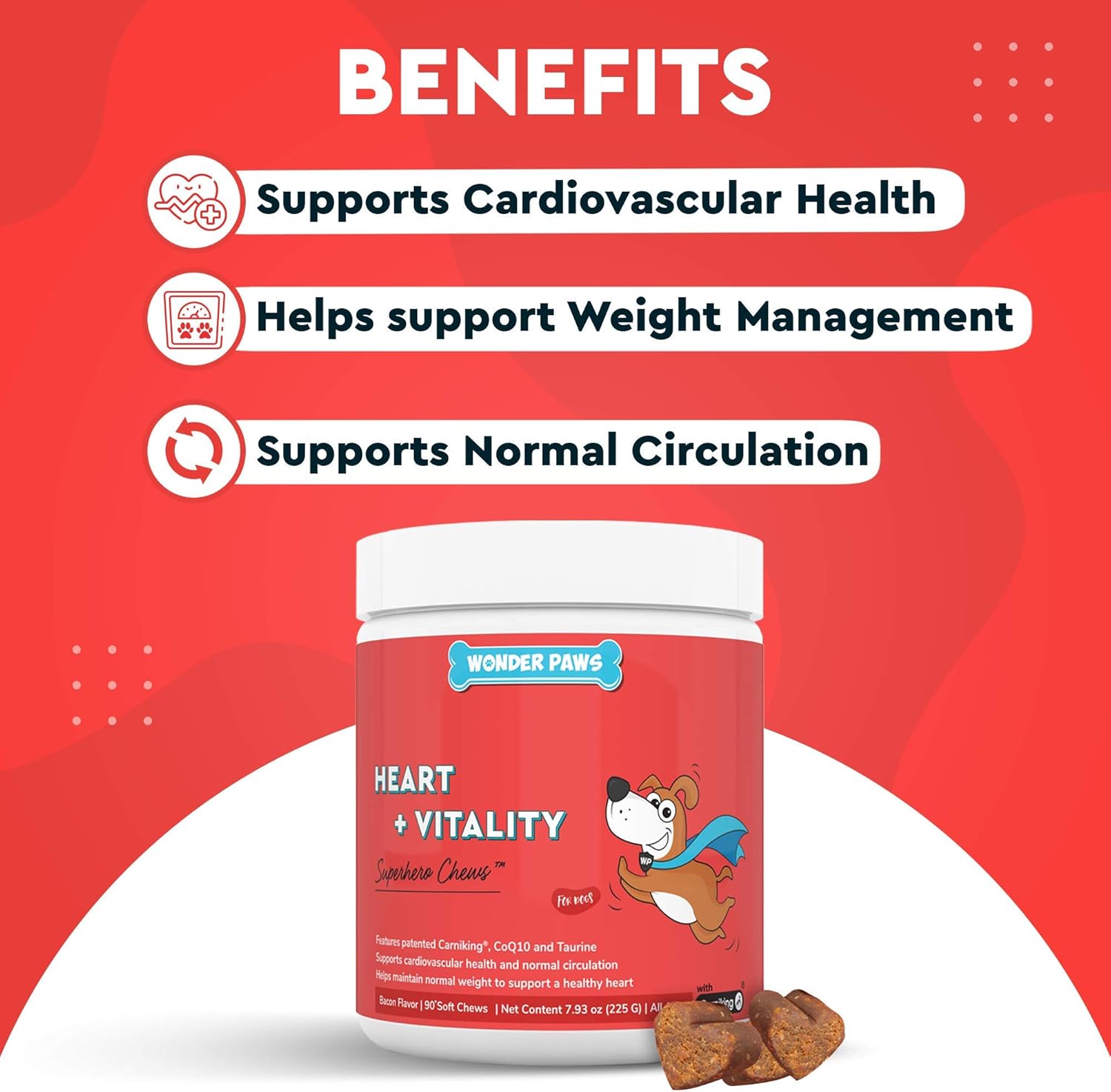 • SUPPORT FOR CARDIOVASCULAR HEALTH WITH CLINICALLY STUDIED L-CARNITINE Wonder Paws Cardiovascular Chews for dogs include Carniking, a clinically studied L-carnitine to support heart health, energy, circulation, and blood flow. We’ve also included a powerful dose of taurine for dogs, hawthorn berry, and CoQ10 for ultimate heart and cardiovascular support. Our cardio canine chews come in a delicious bacon flavor that will have your dog’s tail wagging!