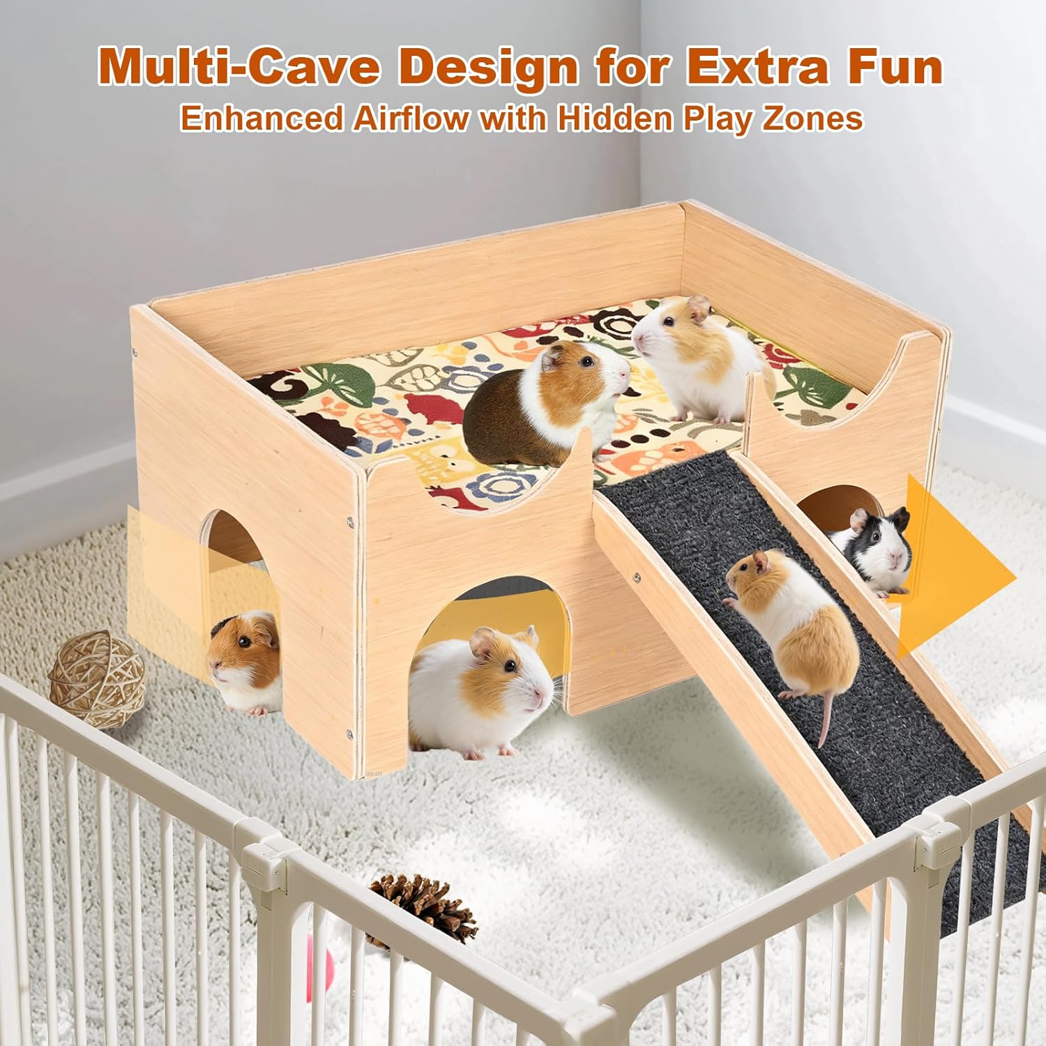 About this item 【Spacious Space for Small Pets】With dimensions of 15" x 9.8" x 7.1" when fully assembled, this two-layer guinea pig hideout is ideal for baby guinea pigs, dwarf hamsters, dwarf rabbits, sugar gliders, mice and other small animals to enjoy. 【Comfort & Durable Construction】Crafted from 7mm-thick natural safe wood with smooth rounded edges, the guinea pig villa features a double-sided mat for comfort and secure screw fixation for maximum stability. Creating the perfect combination of safety, comfort and durability for your pets. 【Multi-Cave Design】Crafted with guinea pig's natural behaviors in mind, our wooden habitat features multiple cozy hideaways. These carefully designed caves provide secure play zones while improving air circulation, creating an optimally comfortable environment for natural exploratory behavior. 【With Non-Slip Stairs】The wooden guinea pig house features non-slip staircase that gives your guinea pig extra room to climb and explore. The extra activity space helps beat boredom and boosts happiness. The stairs are precisely designed to fit perfectly with the pet villa, enhancing safety and stability. 【Easy & Secure Assembly】The guinea pig castle features pre-drilled holes and screw-fastened wooden panels for easy setup. Simple step-by-step directions make assembly fast and hassle-free, creating a sturdy and stable paradise for your guinea pig friend. 【Care Instructions】①Store indoors or in a dry area. ②The mat is machine washable (gentle cycle recommended). Gently wipe wooden frame and felt climbing ladder with a dry or damp cloth. 【Warm Tips】Please refer to the Installation Instructions before assembling the guinea pig castle. If you need assistance, don’t hesitate to reach out—we’re happy to help! › See more product details
