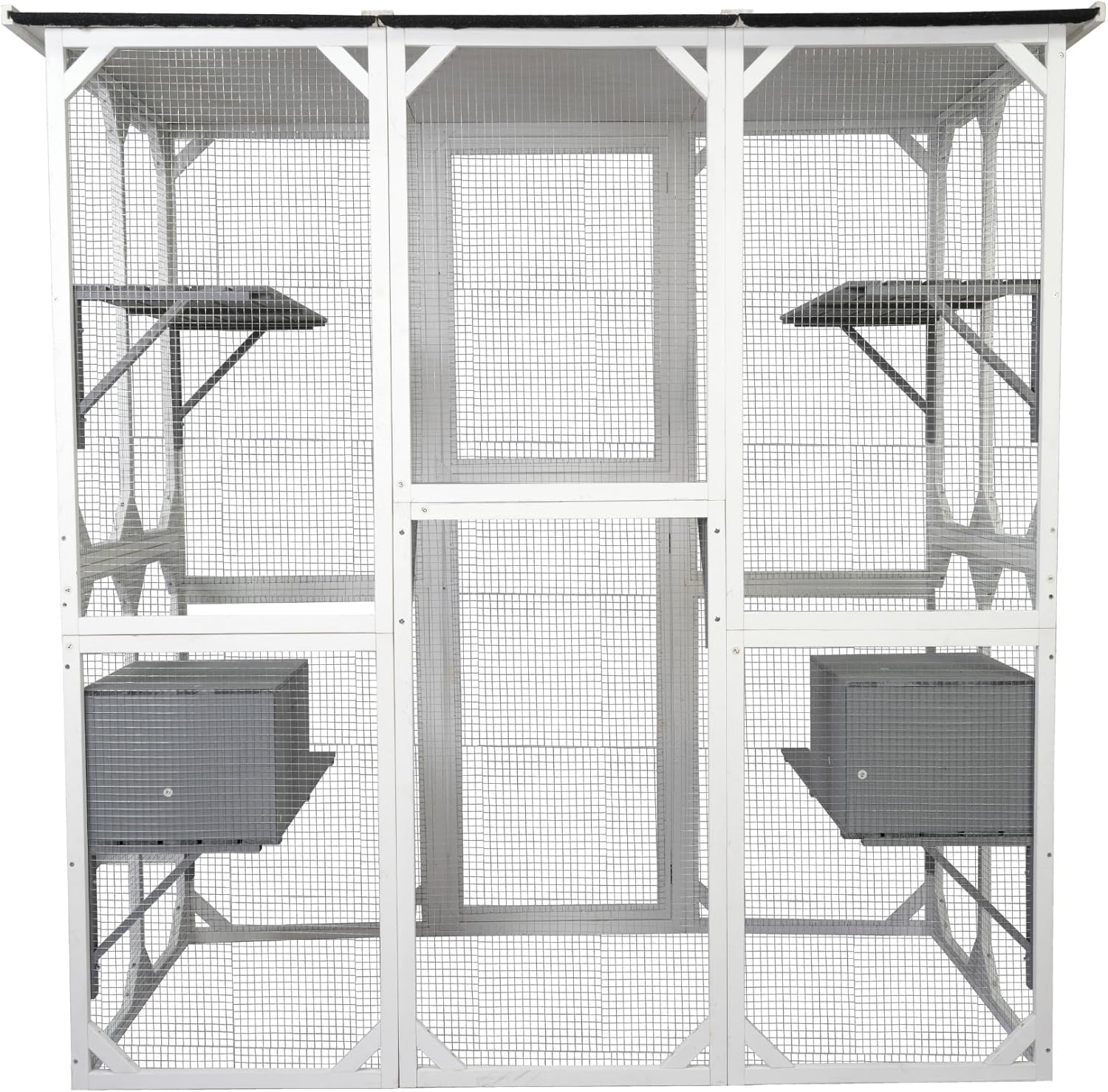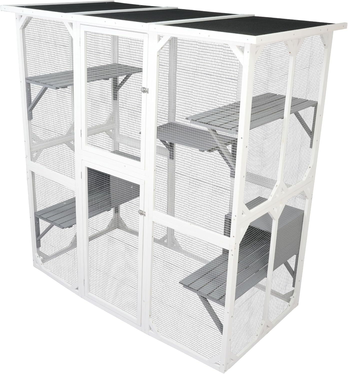 24/21 Customer Support: Our team is always ready to assist youManufacturer Contact: amazonvendorfeedback@gdfstudio.zendesk.comThis charming white wooden cat cage combines functionality with style, offering your feline friend a 70-inch play space with activity platforms and a cozy sleeping area. The waterproof asphalt roof protects against weather, while the durable wood construction ensures safety. Its modern design blends seamlessly with home decor, creating a beautiful and practical pet space that's easy to clean and maintain.
