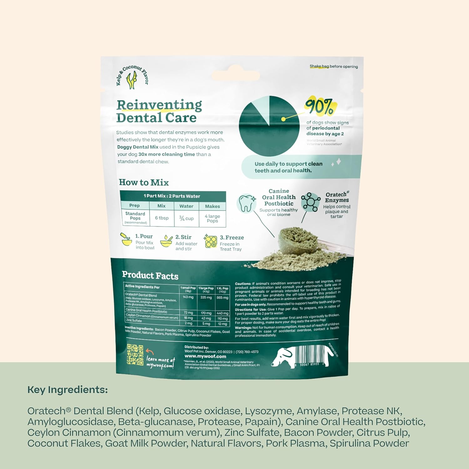 About this item Effortless Dog Dental Care: No more fighting with your dog to brush their teeth! This first-of-its-kind dental solution works with the Pupsicle to give your dog 20+ minutes of effortless tooth cleaning. Your pup will think they’re getting a delicious distraction, but you know you’re supporting their oral health, clean teeth, and fresh breath with every lick! Powerhouse Dog Dental Powder: Over 80% of dogs face dental issues by age 3, but our Doggy Dental Pupsicle Mix helps control plaque and tartar with daily use. Powered by the Oratech blend, it supports a balanced oral microbiome. When used with the Pupsicle, it extends chew time, giving the dental enzyme cleaners more time to work—making dental dog cleaning a fun part of your pup’s routine. Long-Lasting Dog Teeth Cleaning: Each Pop delivers 20+ minutes of dog-powered dental care, giving your pup a fun and tasty way to clean their teeth while you enjoy a little peace and quiet. It’s a win-win for both of you! Easy Daily Dental Care: Simply add water to create a teeth cleaning pop your dog will love. Give them a daily pop to support clean teeth, fresh breath, and better oral health. Support Fresh Breath: Did you know that bad dog breath isn't normal? These dental dog chews contain postbiotics to help support a healthy oral biome, eliminating odor at the source so you can enjoy fresher, sweeter puppy kisses every day. › See more product details