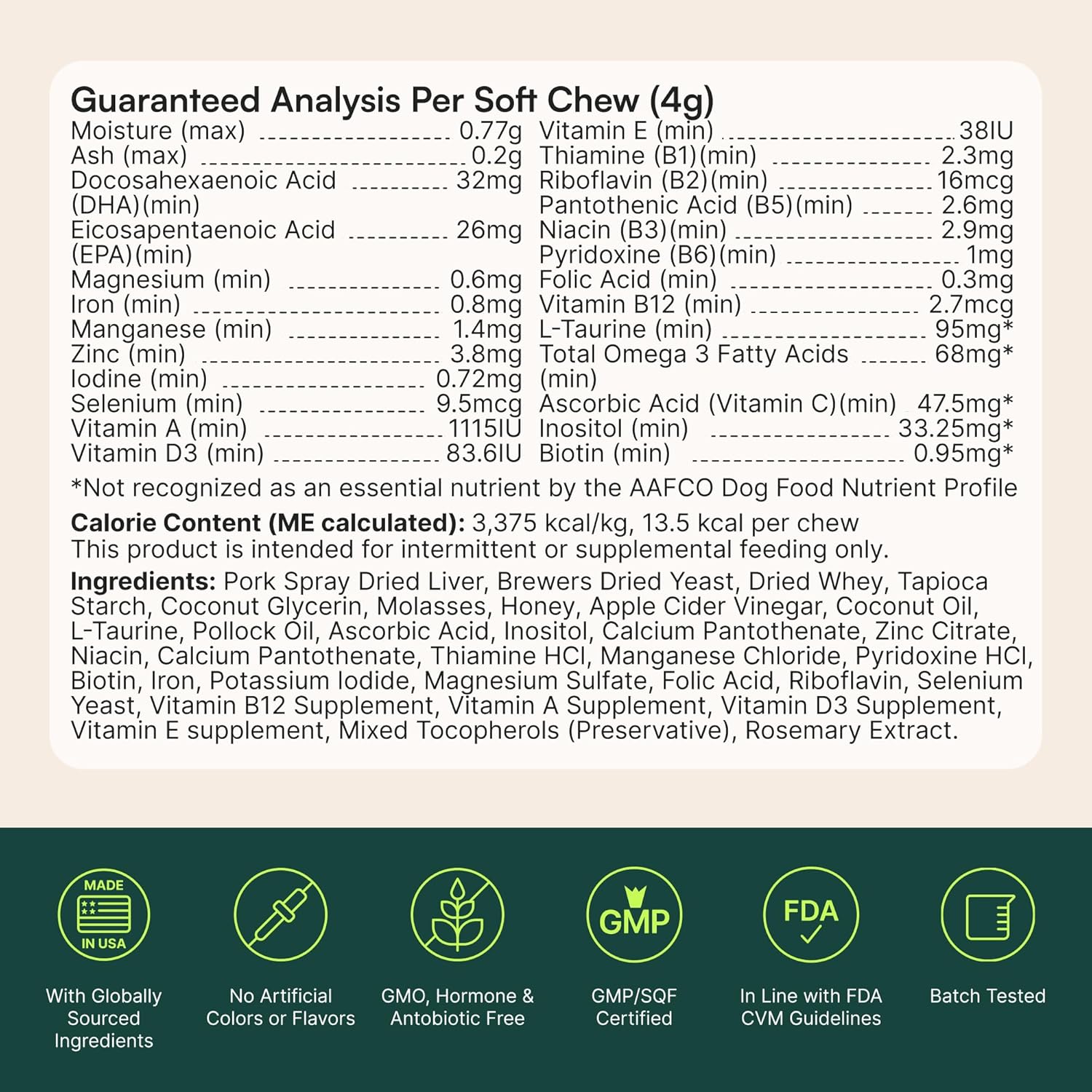 About this item Nose-to-tail support: Our 23-in-1 Multivitamin is a blend of the finest hand selected, scientifically-backed ingredients designed to help your pet start every day with the best paw forward. Our chewable formula specifically targets Skin & Coat, Joints, Gut Health, Eye Health, Brain Development, Oral Health, Heart and normal digestive function of your dog. Scientifically-backed ingredients: Expertly blended by our in-house pet health experts and tailored to the unique needs of our furry friends. We only use human grade, scientifically-backed and sustainably-sourced ingredients, so you can rest assured your pet is getting the absolute best. Easy to chew: The best alternative to hard-to-swallow pills, our irresistibly yummy chews will have their taste buds begging for more. Soft and chewable, they ensure hassle-free consumption, even for senior dogs or puppies. Blend of vitamins and minerals: Our product contains Zinc, Vitamin A, L-Taurine, Vitamin C, Iron, Folic Acid, Vitamin B12, Vitamin D3, ,Wild Alaskan Salmon Oil as a source of Omega-3 fatty acids and much more. Wuffes 23-in-1 Multivitamin is a great addition to any diet and helps to provide a strong nutritional foundation that minimizes the incidence of deficiencies. Trusted Quality: All our products are made in the USA with domestic and globally-sourced ingredients and GMP/SQF Certified. Wuffes complies with all stipulations of the Center for Veterinary Medicineβs national guidelines for pet dietary supplements. A product we`re proud of: Weβre so sure youβll love our products, we offer a 90 day satisfaction guarantee. If after 90 days of daily use youβre not happy with the product or results, all you need to do is get in touch and weβll make it right. βΊ See more product details