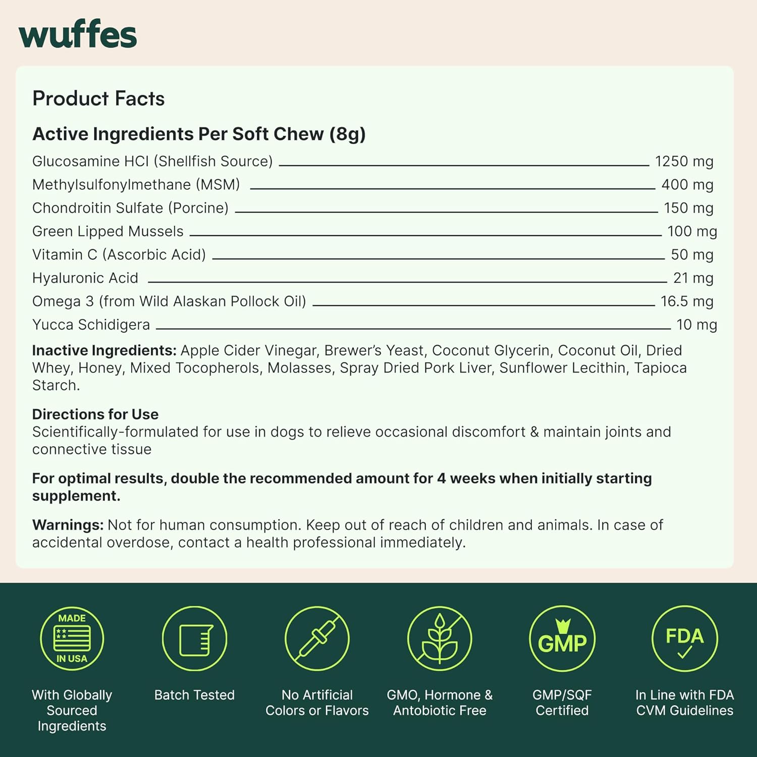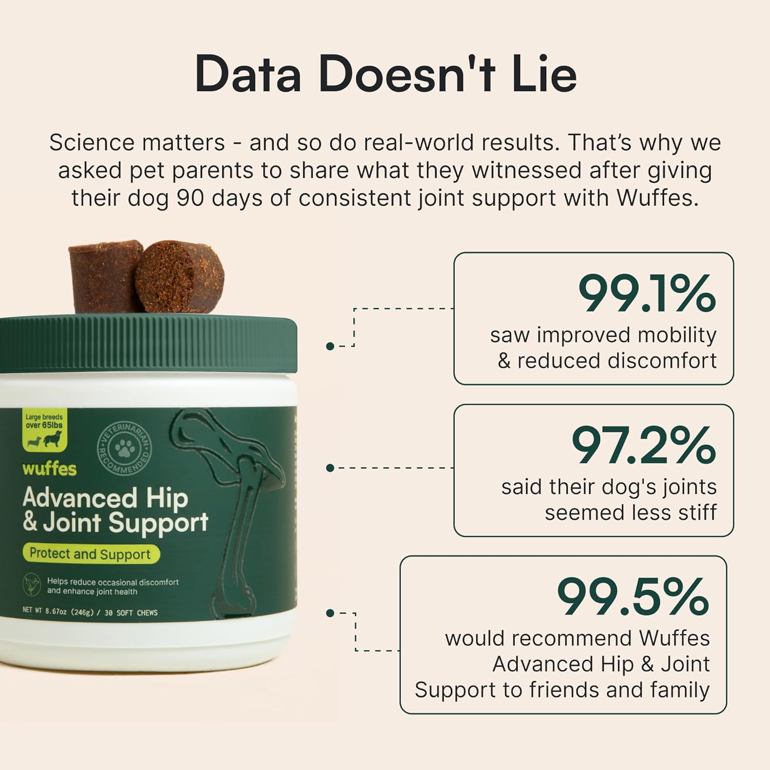 About this item Powerful Joint Support: Advanced Hip & Joint Support chews are designed to help maintain your pet’s joint health and overall mobility, promoting comfort and a better quality of life - especially for aging or active dogs. Supports Comfort & Mobility: Formulated to help maintain joint flexibility and support comfortable movement in dogs who may experience occasional stiffness due to normal daily activity and aging. Our chews help your pup stay active so they can keep doing what they love. Scientifically-Backed Ingredients: Expertly formulated by our in-house pet scientists, Wuffes Hip & Joint Support is made with ingredients known to help maintain healthy cartilage, promote joint integrity, and support long-term joint health. Joint Support for Large Breeds: Our chewable supplement is specially formulated with a higher concentration of active ingredients to support the unique joint needs of large and giant breed dogs, helping maintain healthy joint function and comfortable mobility as they grow and age. Highly Digestible: Designed to be gentle on the stomach, our joint chews are suitable for pups with sensitive tummies - because the best joint support should also be easy (and tasty) to take. › See more product details