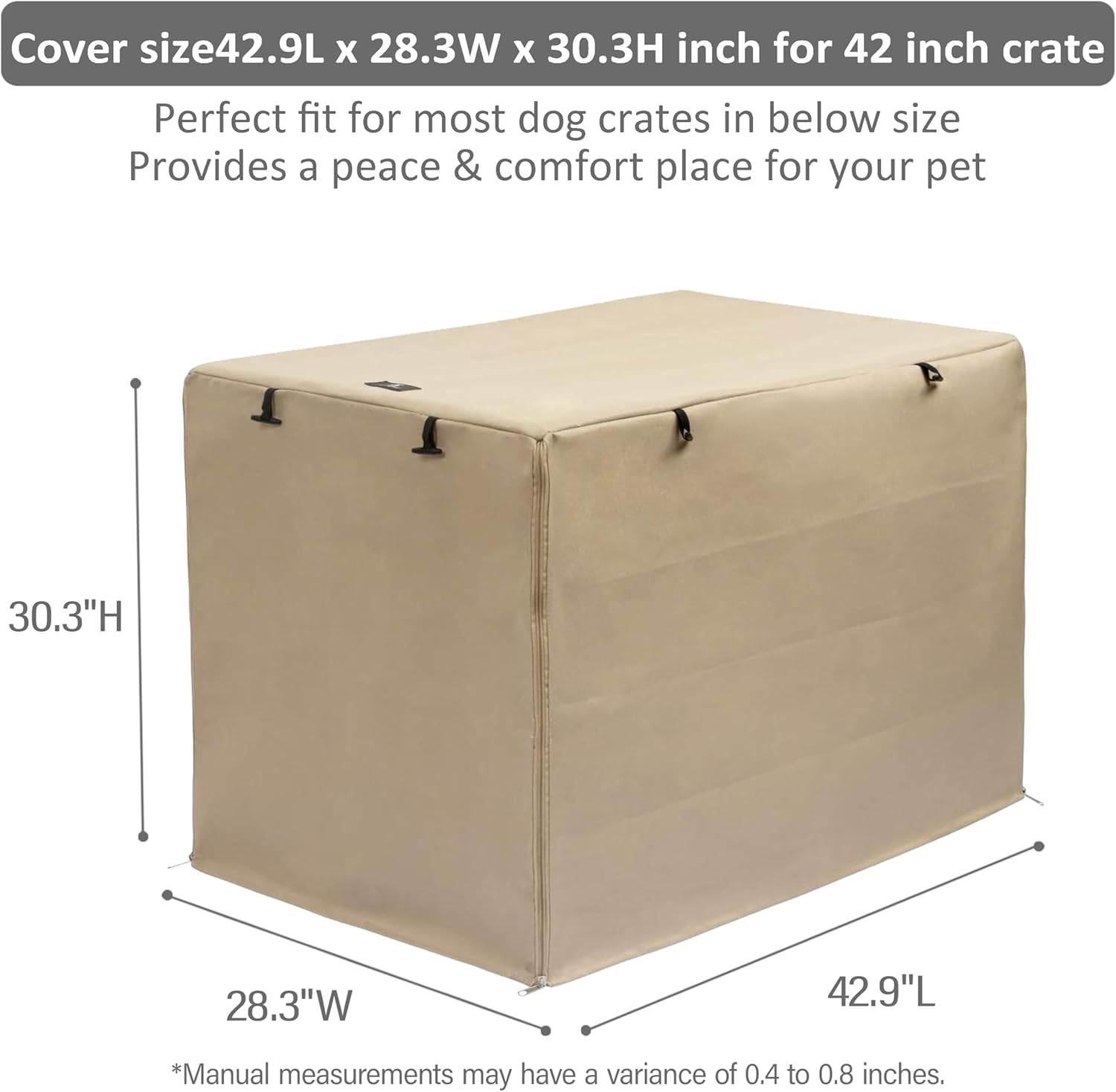 About this item 【Dimension】: 42.9”(L)x 28.3”(W)x 30.3”(H). Universal fits your 142.9” crate well. Package included 1 x crate cover (without metal crate). 【Quiet, Privacy& Security】The crate cover can provide pets with a quiet, private and relaxing environment, allowing them to rest better in this comfortable environment. 【Heavy-Duty & Durable Material】Durable dog kennel cover made of tear resistant and water resistant 420D polyester with PVC coating,which is windproof and durable, prevent damage caused by pet scratching. 【Multiple Zippered Panels】Fits for door open at different angles, you can choose the angle of opening the door according to your needs, which is convenient for pets to enter and exit, and better ensure ventilation. 【Easy to Use】Velcro and toggle lock can fix the roller blinds very well, easy to use, and the cover can be folded when not in use for easy storage. › See more product details