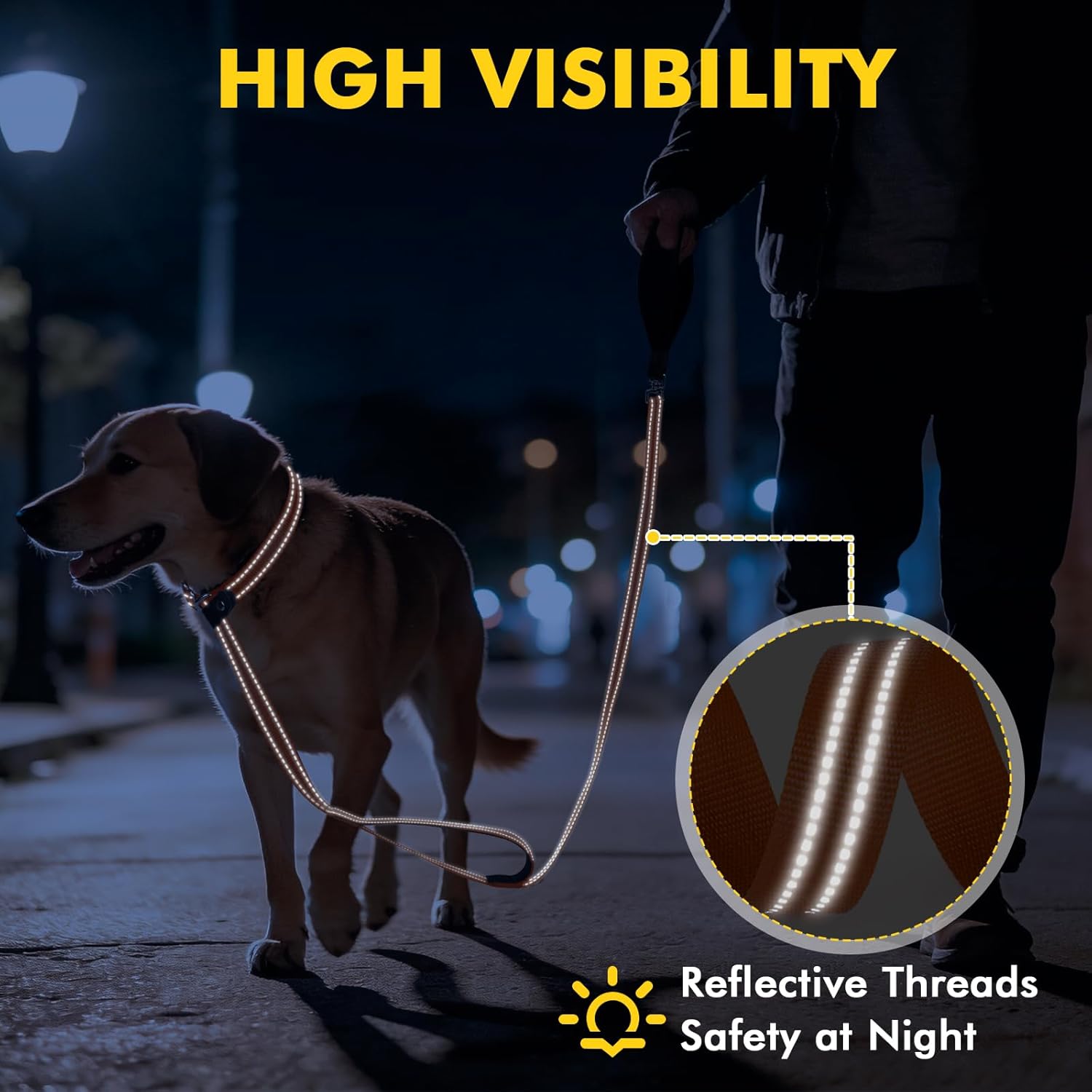 • Enhanced Night Safety with Reflective Threads Your evening and early morning safety is our priority. High-visibility reflective strands are woven directly into the entire length of the slip lead for dogs using unique knitting technology. This creates a brilliant glow when hit by headlights, keeping you and your dog seen and safe during low-light outings.