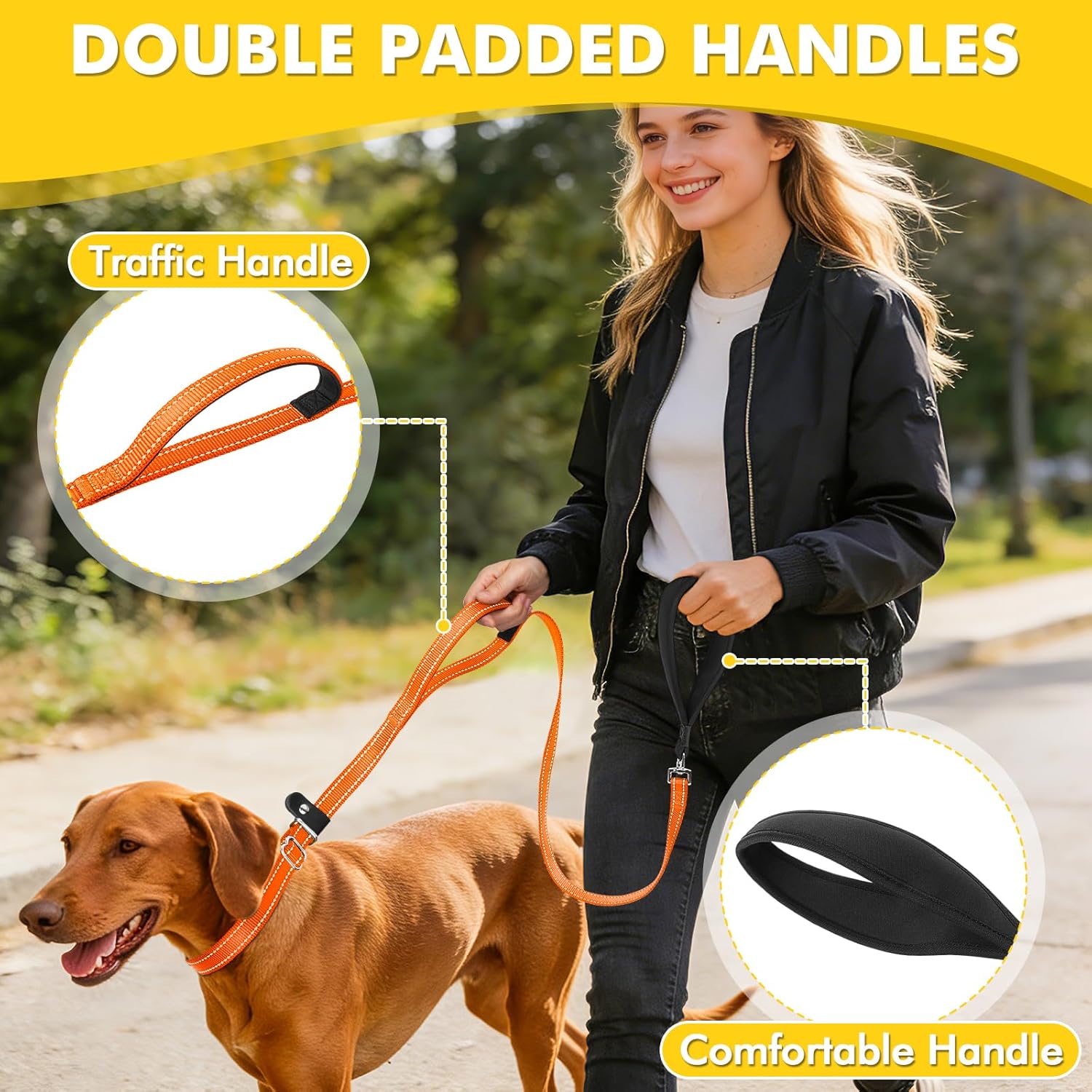 • Dual-Handle Design for Superior Control Gain instant leverage and better control with the convenient second handle near the base of the loop. When your dog pulls or needs close guidance, this feature allows for faster, more gentle correction, making it easier to manage pulling and direct your dog's behavior effectively.