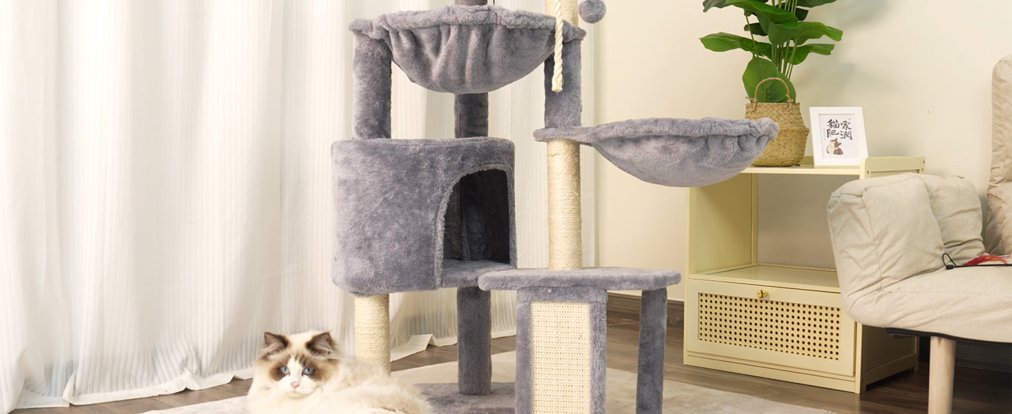 About this item The two hammocks and cat condo can let cats sleep and relax.Notice:Please try to place against the wall. High quality faux fur, natural sisal posts durable for long time scratch by cats. Two hanging balls provides lots of fun to cats,and it also can be replaced. The top soft platform can cat lets watch the view outside the window. The rope and scratch ladder can let cats play and grind their claws. › See more product details
