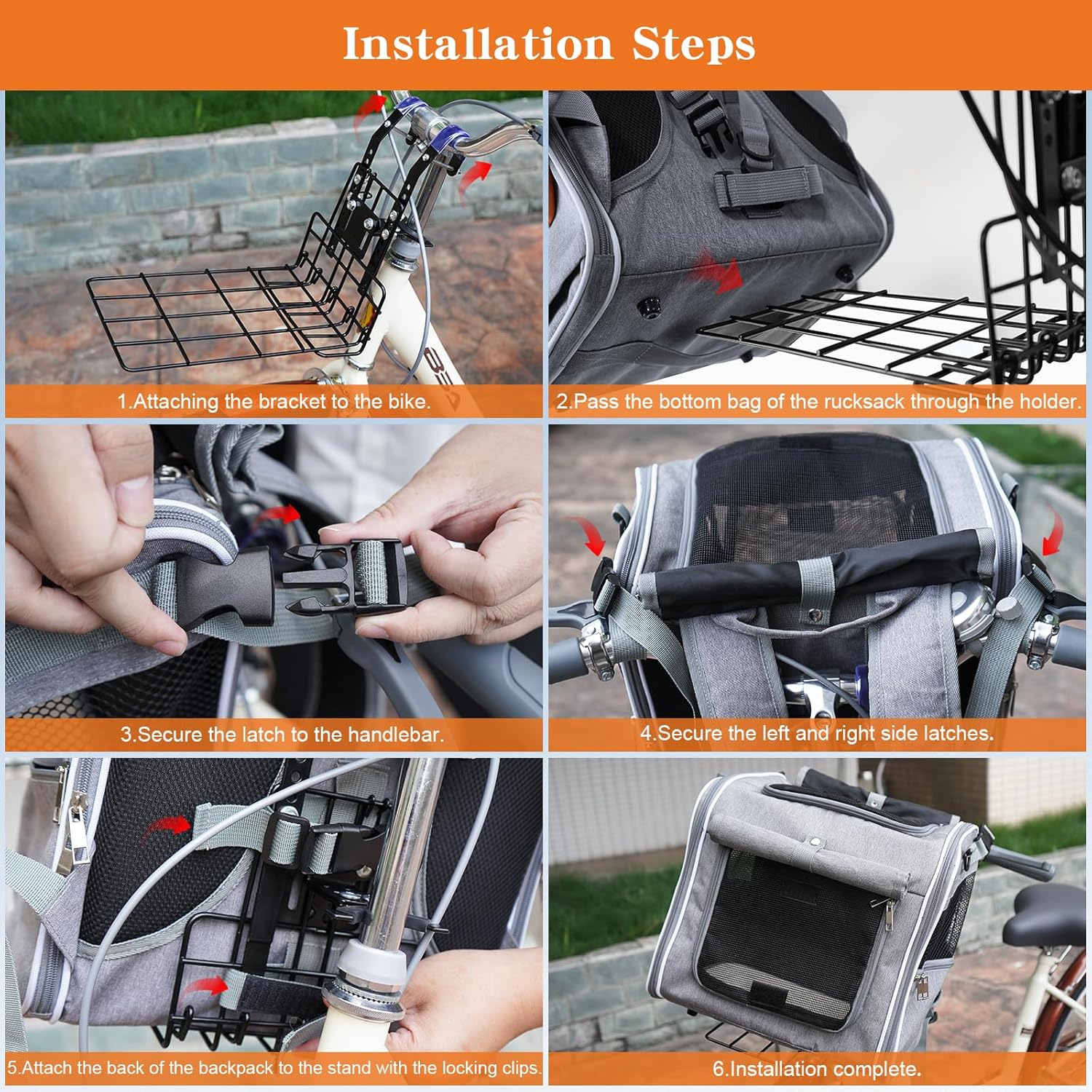 About this item Sturdy Bike Carrier: Our dog bike basket features a durable stand constructed of a sturdy metal frame designed to securely fasten to various models of bikes. It is capable of safely carrying pets up to 7kg and the stand maintains a safe distance from the tyres to ensure stability and safety when riding. Meanwhile the innovative folding design is easy to store and doesn't take up much space Easy-Dismantle Foldable Design: This dog bike basket comes with a special toolkit to ensure a quick and hassle-free installation. Follow the instructions to attach the bike carrier to your handlebars. Then attach the bag to the bracket and bike, the convenient buckle design and adjustable straps allow you to easily attach or detach the pet bag.Folding design for easy storage without taking up space. Versatile Pet Carrier: This multifunctional dog bike basket is not only perfect for cycling but also doubles as a backpack. Adjust it to suit your and your pet's needs for daily outings or adventurous trips. The foldable design provides easy storage when not in use, while multiple side pockets and a handy waste bag dispenser help keep your pet essentials organized. Breathable Design: The bicycle dog basket features a large mesh opening on top, allowing your furry friend to enjoy the ride. With openings from four directions, it's easy and safe to place or remove your dog. The four mesh ventilation windows ensure your pet stays cool and comfortable during the journey. Safety and Comfort: The pet bag is equipped with a Safety buckle that can be fastened to your pet's collar to prevent your dog from escaping.The padded base of the pet basket for bike provides added comfort for your dog, and the removable cushion is easy to clean. The spacious interior allows you to carry your dog's toys, treats, or water bottle, making it an ideal choice for the front bike basket for dog lovers. › See more product details