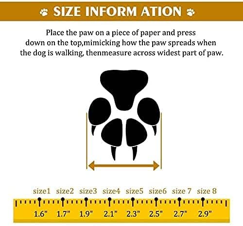 Multi-purpose:1.These boots can keep the dog's paws warm and dry in cold winter.2.It can protect the dog's paws from being burnt in hot summer.3.It can prevent dogs from scratching carpets or wooden floors4.It can protect the dog's paws against hurt from stones, asphalt, grass etc. while walking.5.It can keep the dog's paws clean and dry on rainy days.Measure method:1) Place the pet's paws on a piece of paper and press down on the top, mimicking how the paw spreads when the dog is walking.2) Measure the paw length and width,mark the left and right sides on the paper and measure the distance between the marks.3) Choose size according to width is better.4) Choose the Right size for your dogs.Size Referance:Size 1:(2.3''x1.6'')(L*W) for dogs around 15lbSize 2:(2.4''x1.7'')(L*W) for Schnauzer;Bichon Frise etc.(19.8lb)Size 3:(2.5''x1.9'')(L*W) for Standard Poodle;Schnauzer etc.(Over 23lb)Size 4:(2.51''x2.24'')(L*W) for Akita;American Cooker Spaniel etc.(About 33lb dog breed)Size 5:(2.51''x2.36'')(L*W) for Border Collie;Cooke;Medium Chow Chow etc.(43lb mixed border collie;55lb American Pit Bull)Size 6:(2.83''x2.59'')(L*W) for Medium Samoyed;Husky;Labrador;Medium and large Chow Chow etc.(65lb;70lb pitbull)Size 7:(3.22''x2.91'')(L*W) for Medium Golden Retriever;Large Samoyed;Labrador etc.(75 lb GSP;90 lb German Shepherd)Size 8:(3.22''x2.99'')(L*W) for Large Golden Retriever;German Shepherd,Rottweiler;Old English Sheepdog;Alaska Malamute etc.(80lb labradoodle;90 lb Lab)Warm tips*Don't worry when your dogs start to walk with new shoes.You can try to encourage and guide your love dog to adapt to this new friend - shoes.*Though the dog boots are waterproof, it can not be applied in deep water or in sands, because there may be water or fine sand seepage through sewing needle holes.