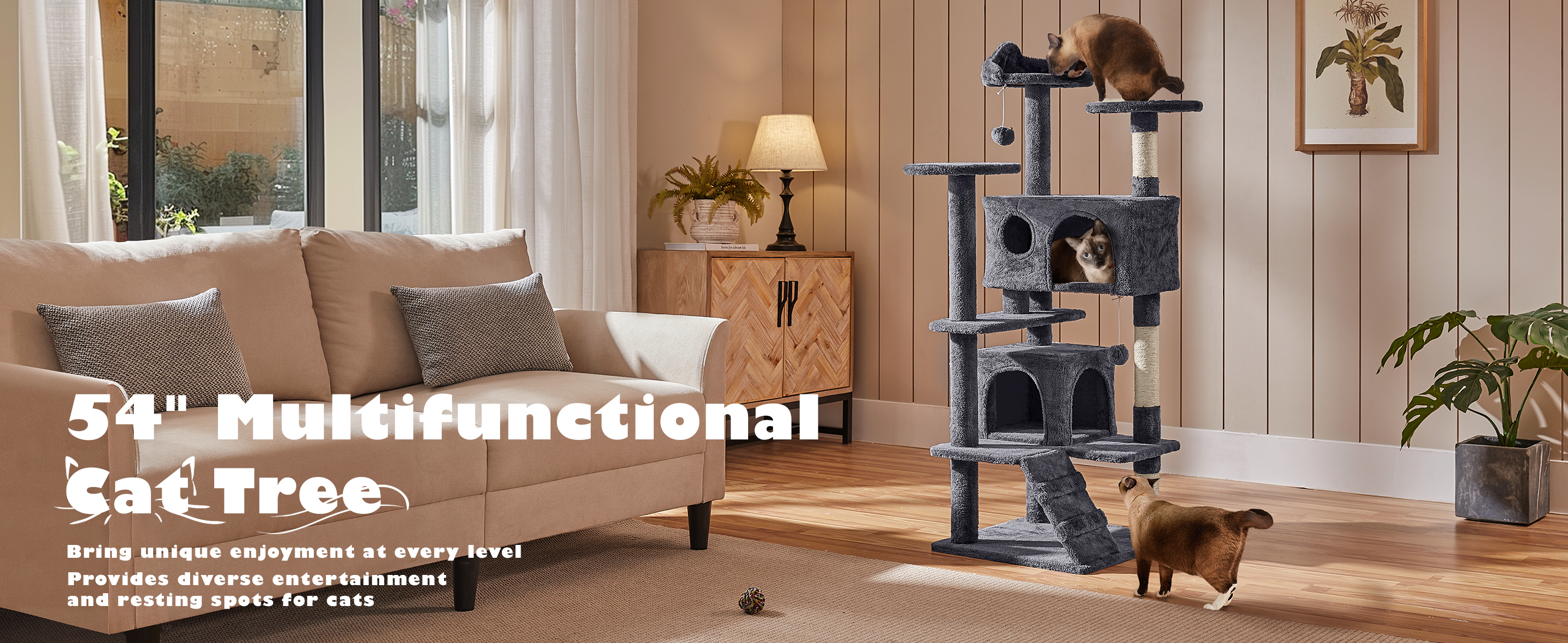 About this item MULTI-LEVEL ACTIVITY PLAYGROUND: With a top perch featuring a cat-ear edge and two round platforms, your cats have the perfect observatories to "survey their kingdom." Two cozy condos and a bottom ladder are ideal for napping and fun climbing. Different height scratching posts help the kitten train muscles and stay healthy REPLACEABLE DANGILNG BALL FOR EXTRA FUN: Two dangling balls with a bell keep your cats entertained for hours. This exciting design stimulates your cat's hunting instincts, allowing them to play and pounce like a wild animal. Plus, it’s replaceable, ensuring endless fun for your feline friends FLUFFY COMFY HIDEAWAYS: Two condos of different sizes provide cozy retreats where your feline friends can relax. Additionally, thespecial dual entrances ensure easy access. This cat haven is perfect forkeeping all your furry companions happy and content SELECTED MATERIALS FOR YOUR FURRY ROYALS: Premium CARB P2-compliant particle board is covered with soft plush, while the posts are coiled with natural sisal, this cat climbing frame provides both comfort and safety for your feline friends STABLE DESIGN FOR SAFE LEAPING: Made from solid particleboard for excellent durability, it features a reinforced base, roundedcorners, and an anti-toppling safety strap, our cat tower is designed to ensure your cat's safety while jumping, playing, or scratching › See more product details