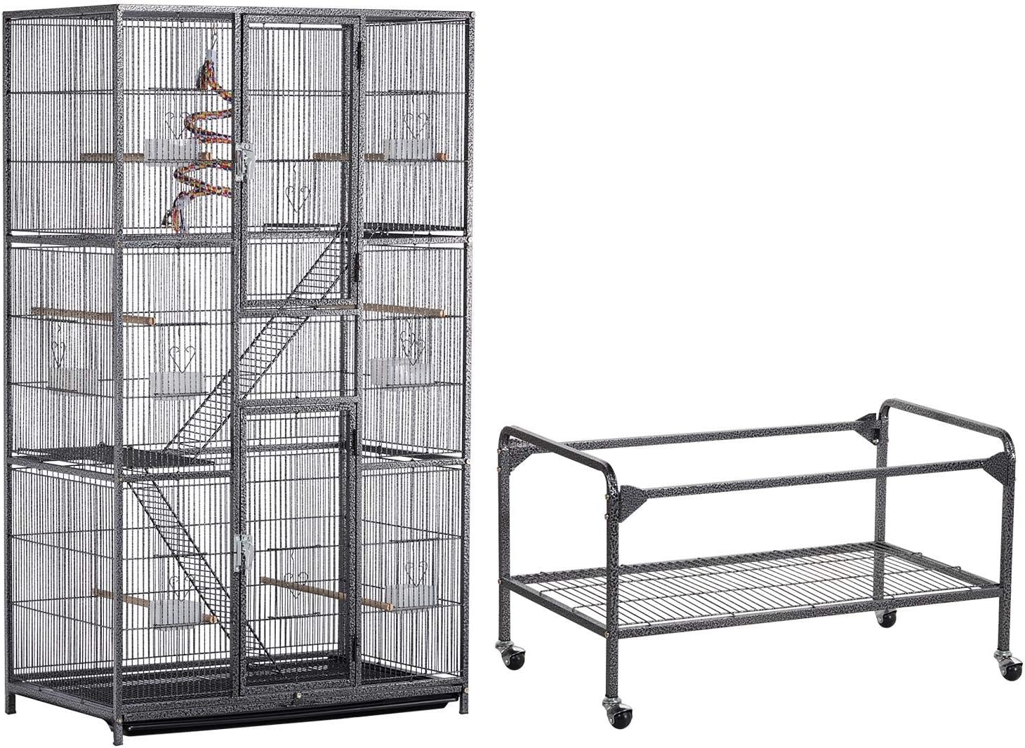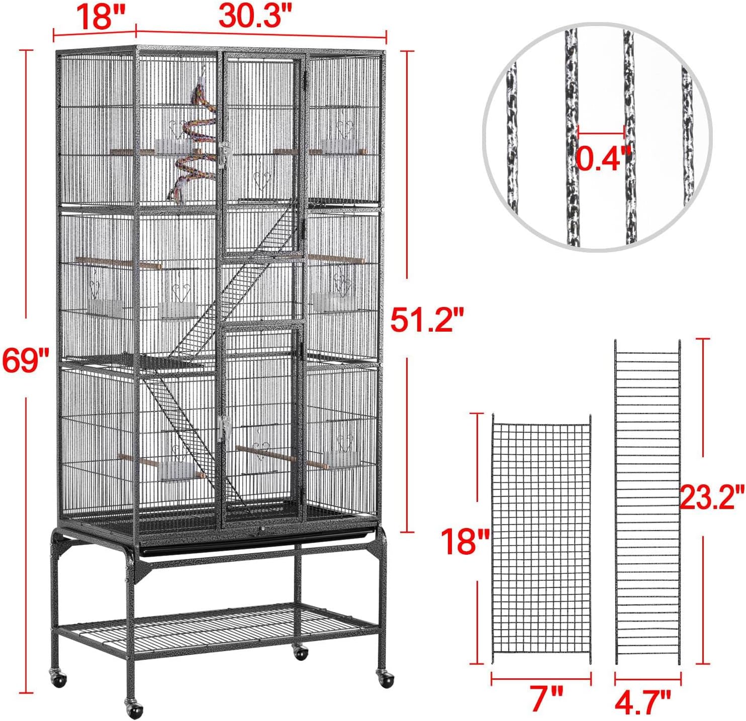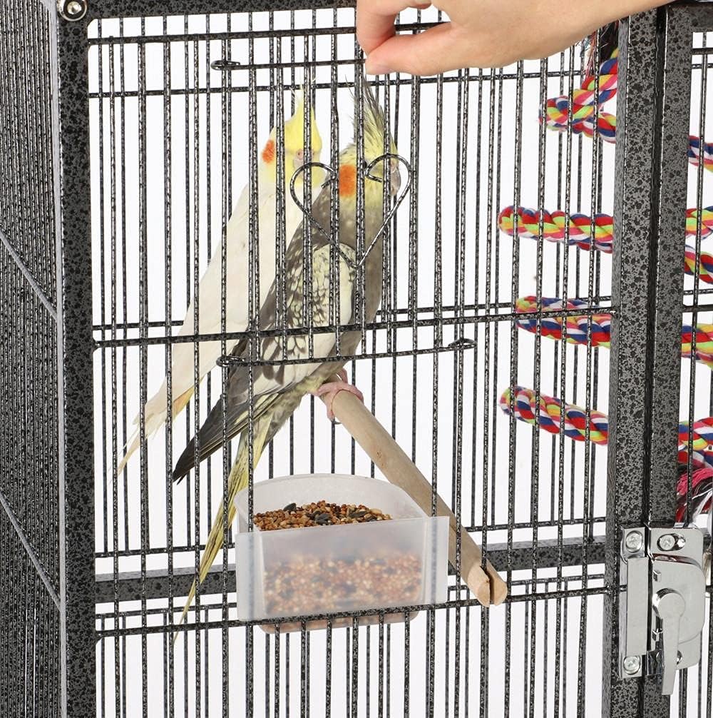 About this item Extra-Large Wrought Iron Cage: With a large size of 30.3” L x 18” W x 51.2’’ H and a bar spacing of 3/8”, this strong wrought iron cage offers a safe and spacious mansion for multiple birds/small animals. The 3-tier design expands the usable area vertically and creates more spaces for pets to climb and explore Deluxe Cage For Small Animals & Birds: This huge pet cage can accommodate more than five small to medium birds like lovebirds, conures, parakeets, budgies, cockatiels or small animals like sugar gliders, rats, squirrels, etc Safe & Sweet Home: Every door is secured with locks to make sure your little escape artists stay safely in their home when unattended. Moreover, the bar spacing of 1cm/ 3/8” is decent for small to medium birds or small animals Platforms, Ladders, Perches, Boing For Unlimited Fun: The 3-tier cage provides ample space for pets to climb and explore, while the six wooden dowels and the rope boing give birds comfortable perching and hopping places at different levels A Full-Package Pet Cage: A strong metal cage is not the only thing you will get from this deal. Six wooden dowel perches, eight feeder cups, and a rope boing are also included to ensure your pets can enjoy their new mansion immediately › See more product details