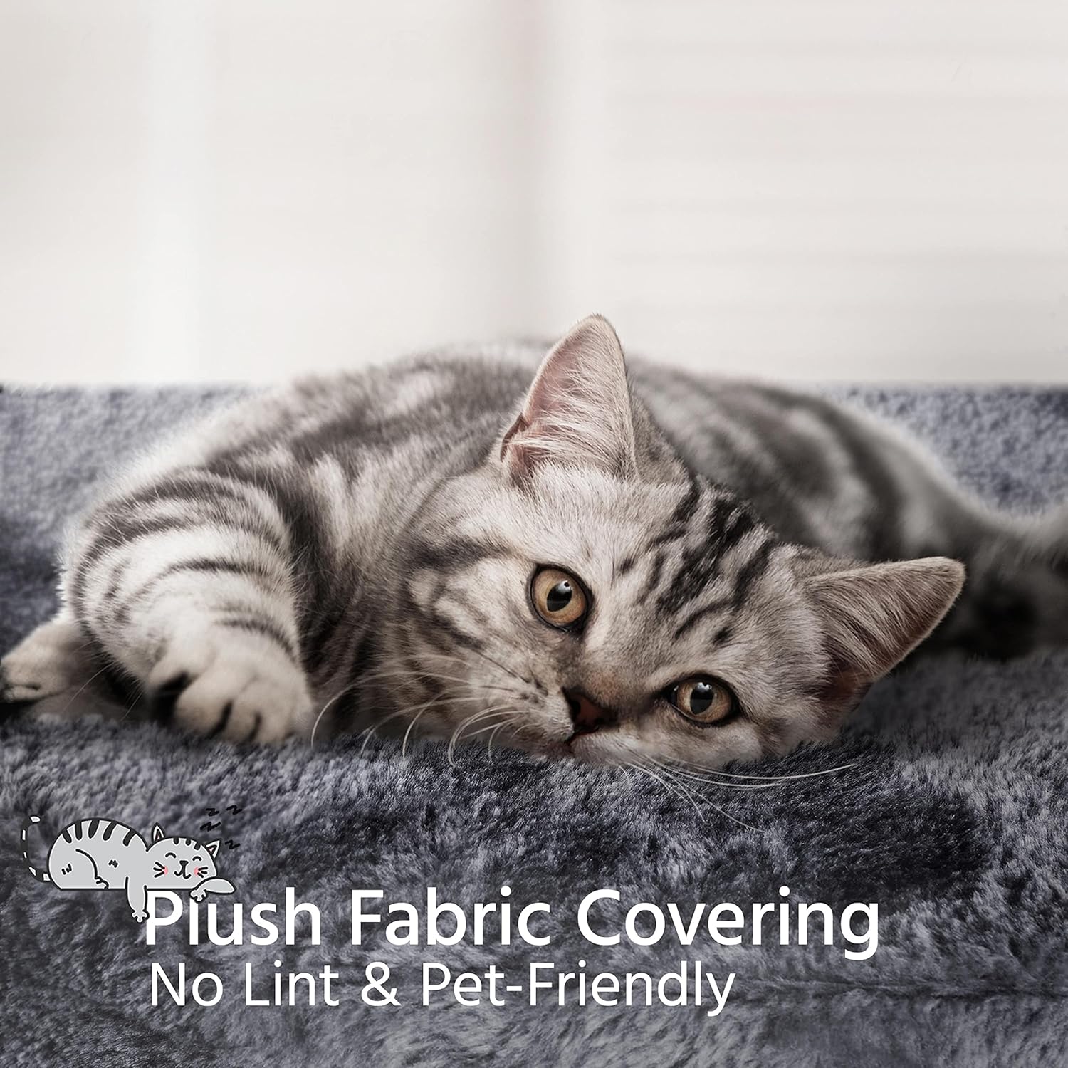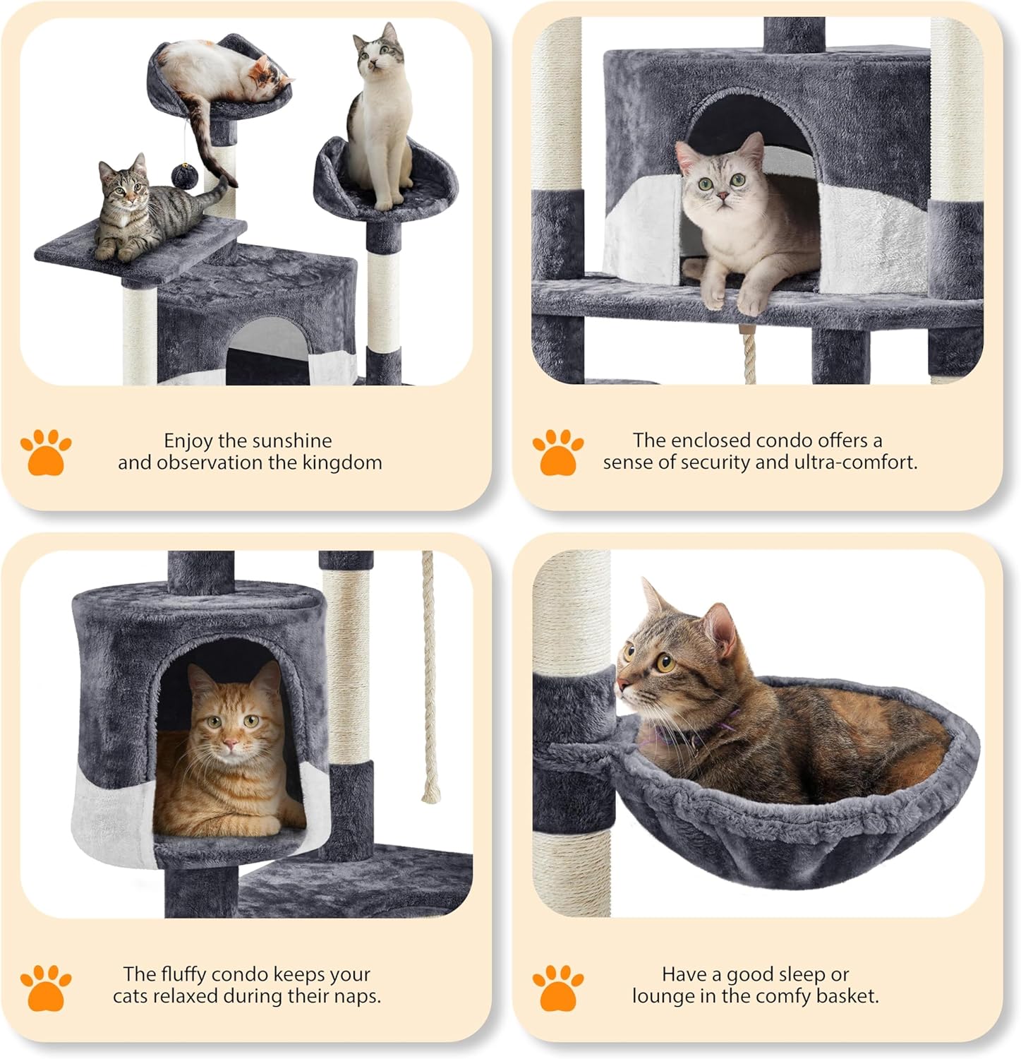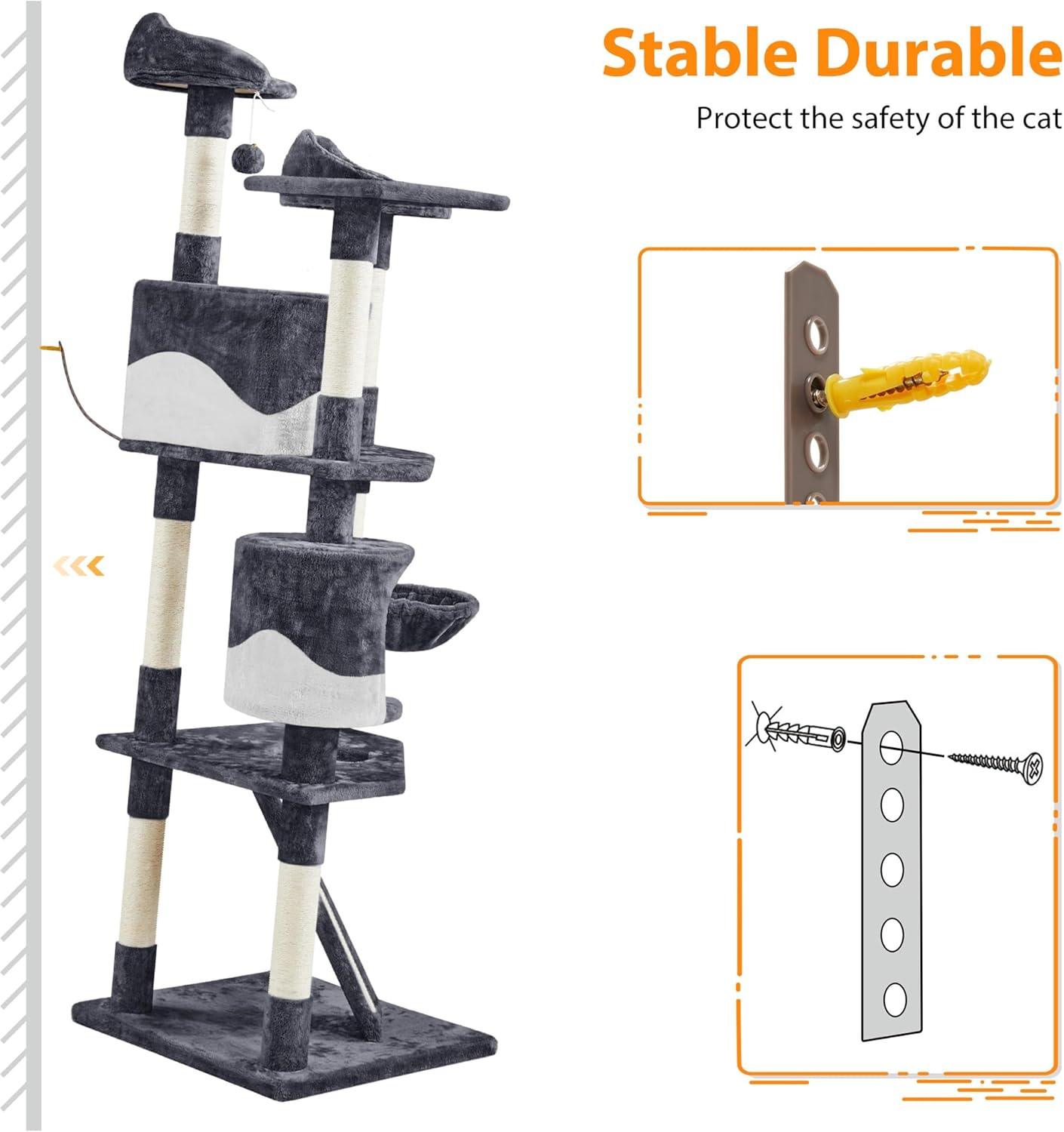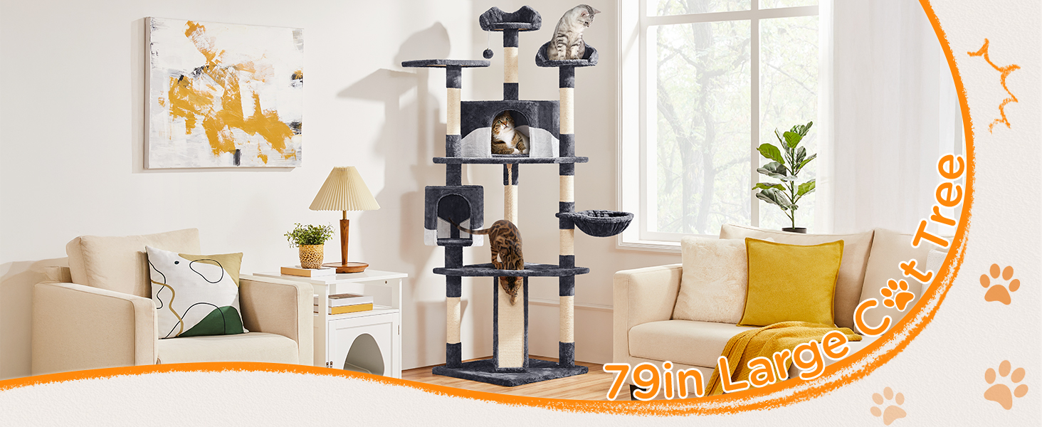 About this item LARGE MULTI-LEVEL CAT TREE: This 79″ H 5 levels cat tree has multiple levels for cats to climb, play, scratch or sleep. With 3 top perches, 2 comfy condos, 1 fluffy basket, removable dangle ball&rope, this is a cat tree can be used for 3-4 cats at the same time CAT EAR TOP PERCHES&LARGE CAT HOUSE: The cute cat-ear shaped raised edges of the top perches add a lovely bit of charm and cuteness to the piece.There are also 2 cozy fluffy condos for cats to play hide-and-seek and nap in MULTIPLE SISAL POSTS&SCRATCH LADDER: Cats are active and lively, 9 sisal rope coiled posts at different heights help them sharpen their claws. There's also a scratching ramp that makes it easy for cats to climb, which is great for protecting your sofa or bed from their claws GOOD QUALITY & STABLE STRUCTURE: This free-standing cat tree is made of high-quality CARB P2-compliant particle board and is covered with soft plush, while the posts are wrapped in natural sisal. It has an anti-toppling strap that you can attach to the middle board and use to hang it on a wall ESSENTIAL FOR HOMES WITH CATS: Our cat tree has been prepared in several neutral tones to ensure that our cat furniture complements your home. Keep those sharp little claws away from your fine furniture, It is very suitable for families with multiple cats › See more product details