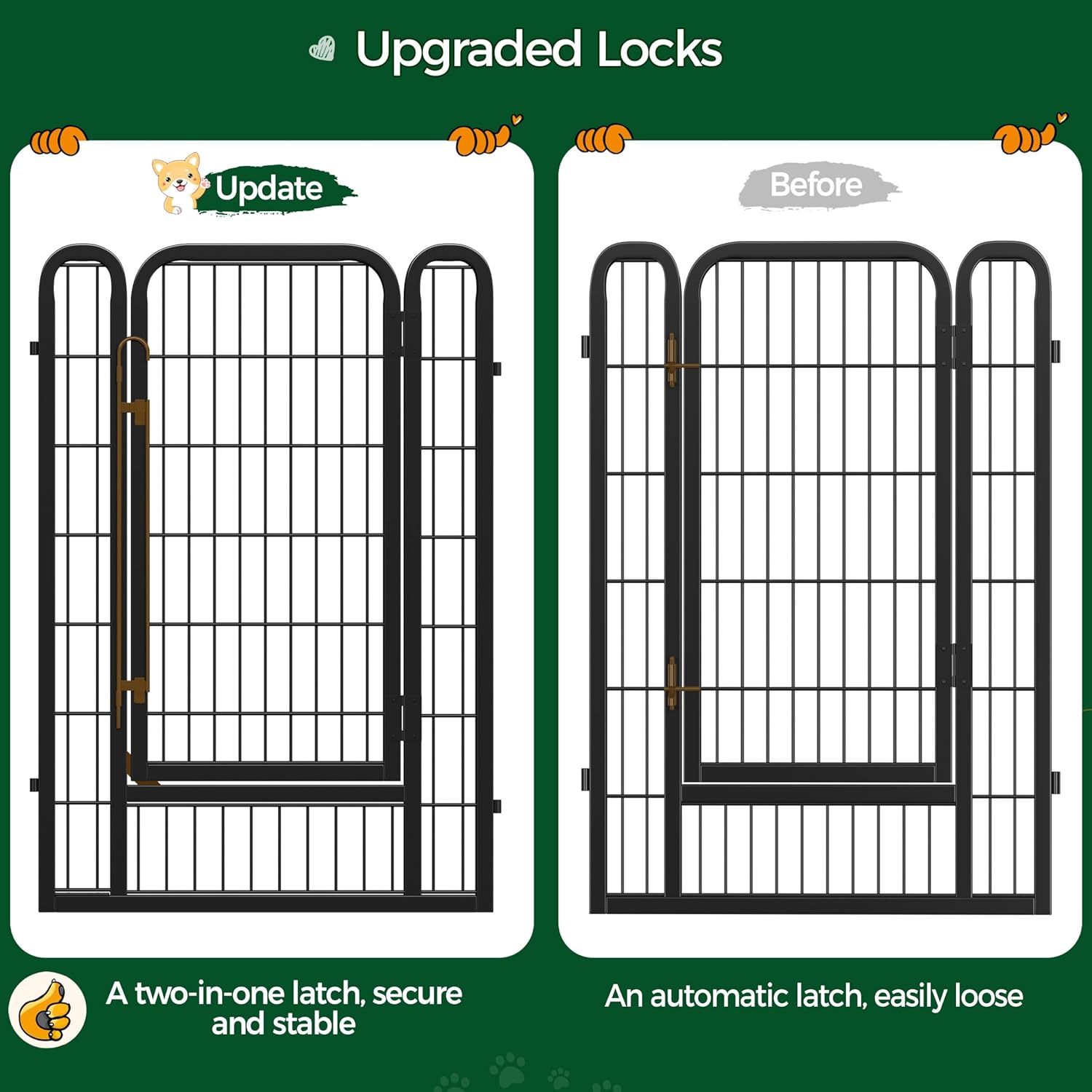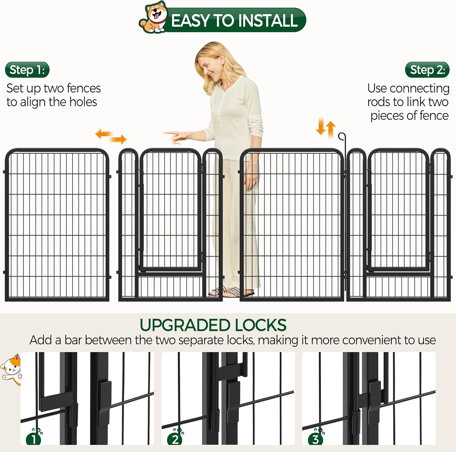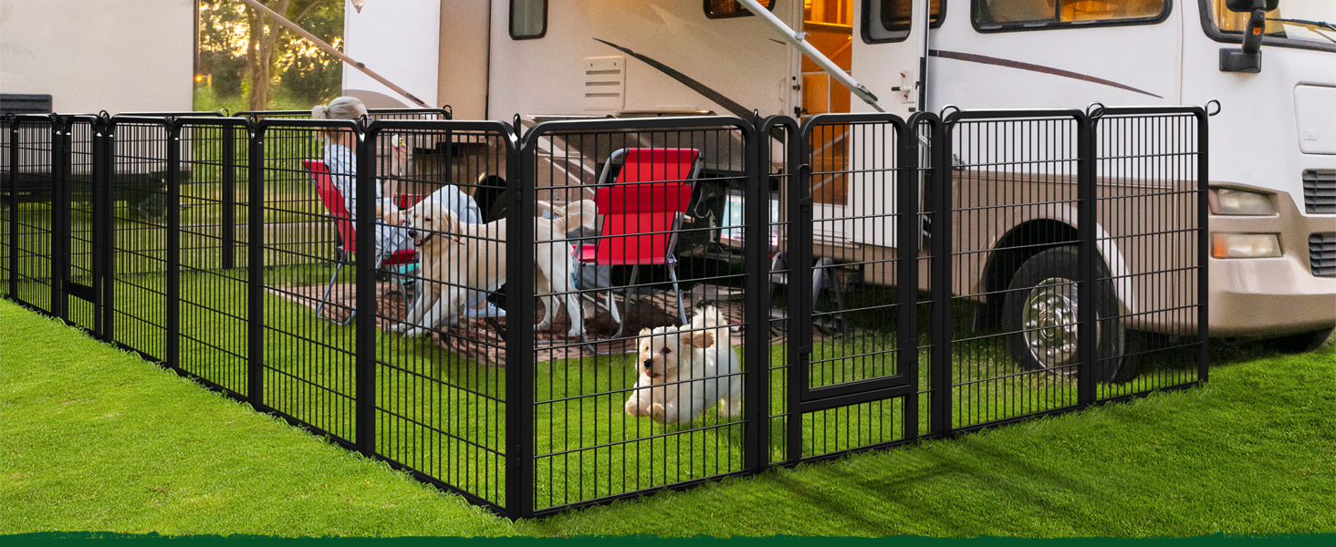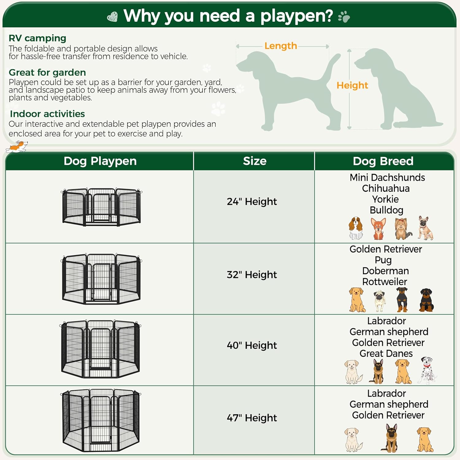 About this item Great for Camping: The foldable and portable design of this puppy playpen allows for hassle-free transfer from your residence to your vehicle, making it a perfect addition for those looking to go RV camping or travel with their pets Not Just for Dogs: This dynamic and expandable pet fence is not limited to dogs and is suitable for small or medium-sized animals such as toy poodles, corgis, rabbits, ducks, bunnies, and puppies. It can be used both indoors and outdoors Creating Different Shapes: Each panel of this versatile dog playpen measures 27″ W × 39.5″ H. By connecting them with metal bars, the playpen can be assembled in various shapes and sizes, including square and rectangular configurations. Add or remove panels as needed to achieve the desired shape Safety & Security: Ensuring the safety of your pets is of utmost importance to us. Our exercise pen is crafted with appropriate bar spacing and two latches that lock automatically as you close the door. Rounded edges also protect animals from injuries while preventing damage to wood or PVC floors. Additionally, stakes anchor the panels firmly to the grass or soft ground No Tools Required: Simply unfold, shape, and connect the dog playpen together, exercise pen can be set up in seconds and folds flat for easy storage or travel › See more product details