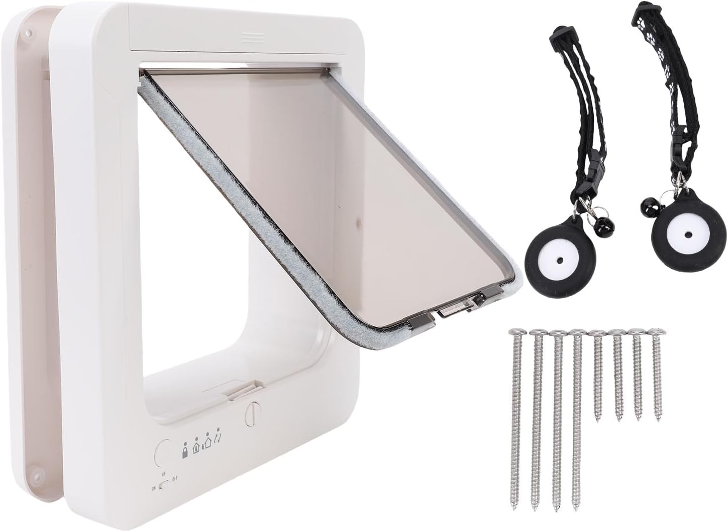 Spec: Item Type: Smart Pet Door Material: Plastic Size: Approx. 26x29.5cm / 10.24x11.61in Battery Type: 1.5V AA Battery x4 (Batteries Not Included) How to Use: Simply assemble and install the battery to start using. Packing List: 1 x Pet Door 1 x Assemble Door 2 x Collar 8 x Screws 1 x Instruction Manual 5 x Accessories