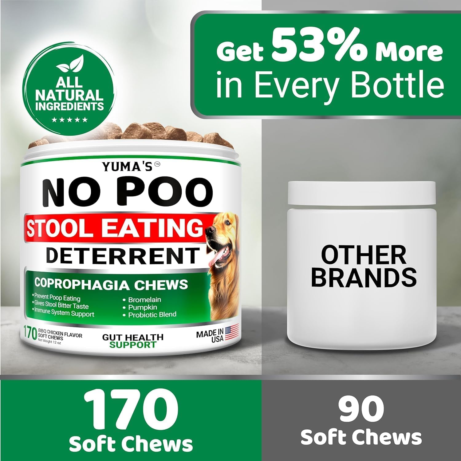 About this item Discourage Stool Eating Behavior: Our coprophagia deterrent for dogs chews are specially formulated to deter dogs from consuming their own stool, ensuring a cleaner and more hygienic environment for your beloved pet and home Enhances Digestive Wellness: Packed with digestive enzymes and probiotics, our stool eating deterrent for dogs not only deter stool eating but also promote a healthy gut, improving nutrient absorption Developed by Veterinary Experts: Crafted with a blend of premium, natural ingredients, our dog poop eating deterrent is formulated by veterinarians to support healthy digestion and reduce the urge to eat feces Proudly Made in the USA: Made in the USA with high-quality, natural ingredients, our anti poop eating for dogs treats ensure safety and effectiveness, backed by rigorous testing and GMP standards Tasty and Convenient to Use: These tasty dog eating poop deterrent chews are irresistible to dogs, making them a stress-free supplement. Simply add to your dog's daily routine for effective results without any fuss › See more product details