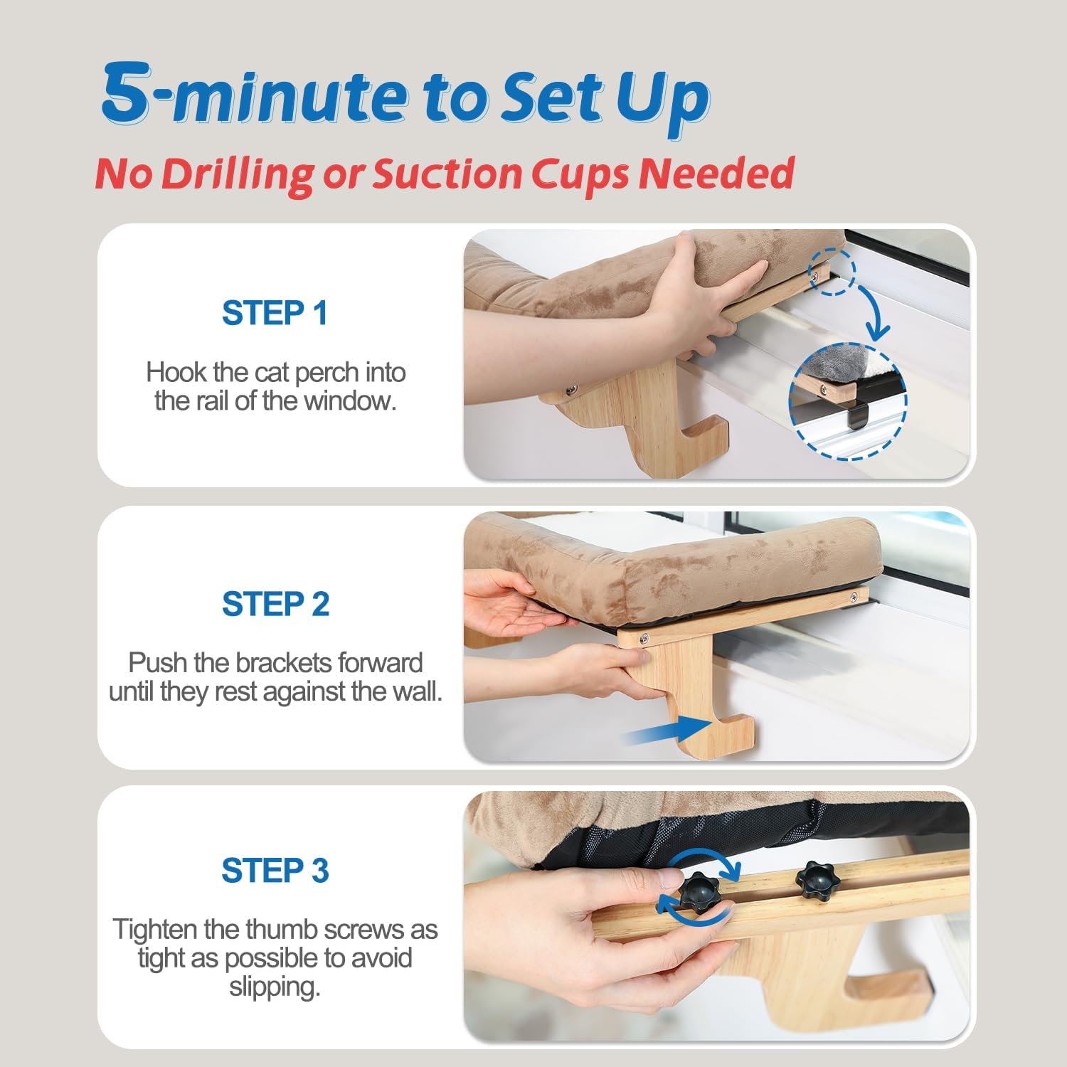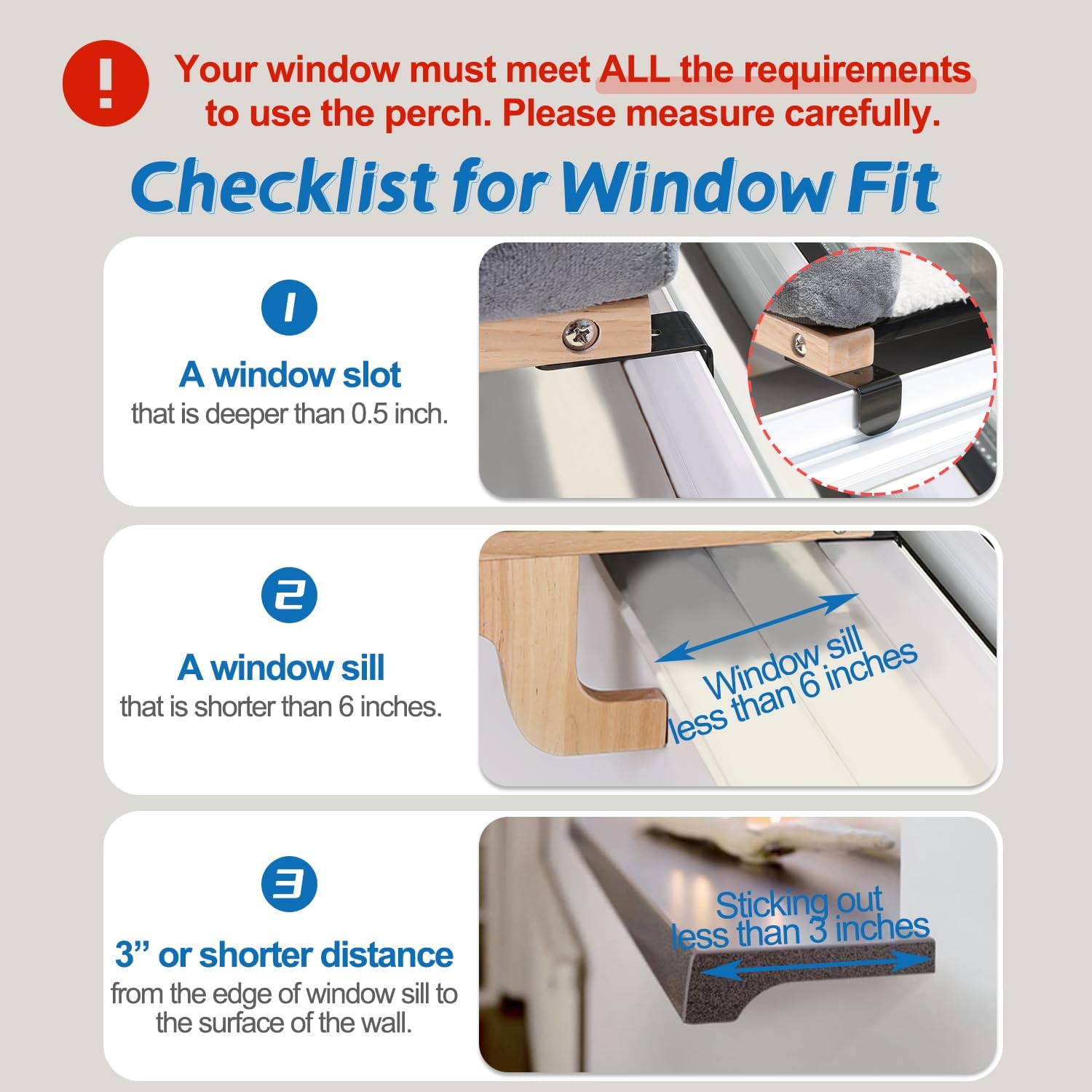 About this item 【No Suction Cups or Drilling Needed】 Ensure your window has a SLOT at least 0.5 inches deep for the perch to hook onto (hook thickness: 0.08 inch). The bracket is widely adjustable to fit various setups, with a maximum window sill depth of 9 inches. 【Unobstructed View & Large Space Cat Lounge】Holds up to 40 lbs. With bed size: (L: 24'' x 15'', XL: 26.4'' x 15''), Our Comfy cat perch for window sill offers a generous lounge area for your cats to stretch, play, and enjoy the view. The perch can be moved from window to window by simply lifting it up. 【Supportive and Secure Design】Featured soft bolsters on three sides, the plush bed provides gentle support to your cat's joints and muscles, providing a secure and enclosed sleeping space to curl up and nap in the utmost comfort. 【Sturdy Build & High Quality Material】Our cat window perch is crafted from premium hardwood and machine washable fabric. Rest assured that your cat can safely perch by the window without any wobbling or tilting. 【Top-notch Customer Service】Please contact us for assistance. We value our customers and strive to deliver the best experience possible, making sure you and your cat are delighted with your new cat window perch. › See more product details