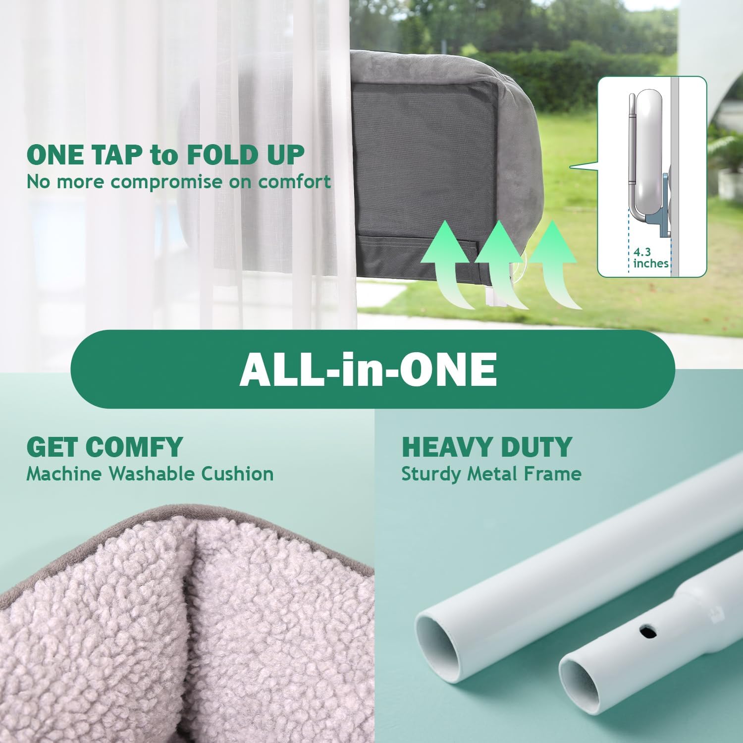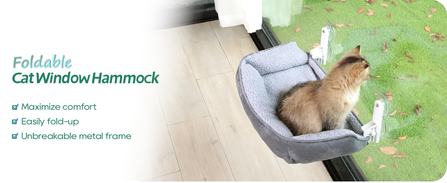 About this item 【Foldable Convenience】Effortlessly folds up, allowing for curtain closure, easy storage and transportation. Set it up in seconds and fold it away when not in use, without compromising on your cat's comfort. Distance from window when folded: 4.3 inches. 【Machine Washable Bed】Embedded a fluffy bed made from high-quality materials. Simply pop it into the washing machine for a quick refresh, keeping the bed free from odors and dirt and ensuring a cozy and hygienic spot for cats to relax and enjoy the view. (Bed size: 24'' x 14.5'') 【Robust Metal Frame】Built to last. Features a sturdy metal construction that provides excellent support and stability. Ensures that your cat can confidently jump, stretch, and explore without any wobbling or tipping over. Suitable for adventurous cats. 【Supportive and Secure Design】Featured soft bolsters on three sides, the plush bed provides gentle support to your cat's joints and muscles, providing a secure and enclosed sleeping space to curl up and nap in the utmost comfort. 【Free Suction Cup Replacement】We offer one year free suction cup replacement. We value our customers and strive to deliver the best experience possible, making sure you and your cat are delighted with your new cat window perch. Please contact us for assistance. 【Soaking the suction cups in hot water for 3 minutes】 **Enhance adherence to window & Regain best shape if they've been deformed during shipping.** › See more product details