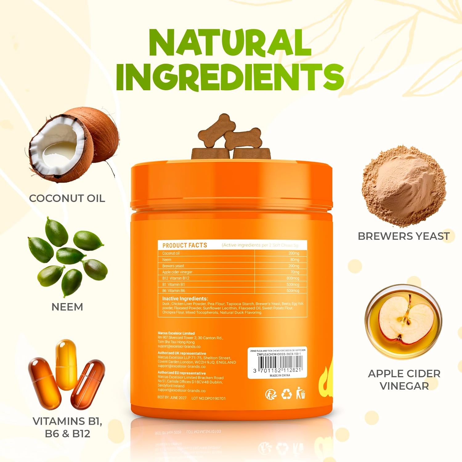 About this item ðķ GOODBYE FLEAS, HAPPY DOGGIE: Our dog flea and tick chew is specially formulated to defend your puppies from pest, flea and tick. Perfect for small, medium or large dogs! ð NATURAL INGREDIENTS, SAFE AND SOUND: Our composure flea dog treats are packed with premium ingredients including Coconut Oil, Apple Cider Vinegar, Brewers Yeast, Neem Extract and Premium blend of Vitamins B1, B6 & B12. These chews offer natural, safe, and effective protection against ticks and fleas. ðĶī DELICIOUS FLAVORS DOGS LOVE: Available in chicken, beef, and duck flavors, these flea and tick prevention chews are not just effective but tasty too. No more wrestling with your pup to take their dog treatment; they'll be begging for more of these delicious treats! ð FAST-ACTING, LONG-LASTING: Our chews start working within 30-45 minutes, providing up to 24 hours of protection. Perfect for those moments when your dogs want to play outside, ensuring they can fully enjoy their day without any discomfort. ðū WE'VE GOT YOUR BACK â AND YOUR DOG'S! Enjoy the confidence of a 5-year assurance and our friendly customer service team, available 7 days a week. We're here to ensure your furry friend stays happy and healthy, because we care just as much as you do. âš See more product details