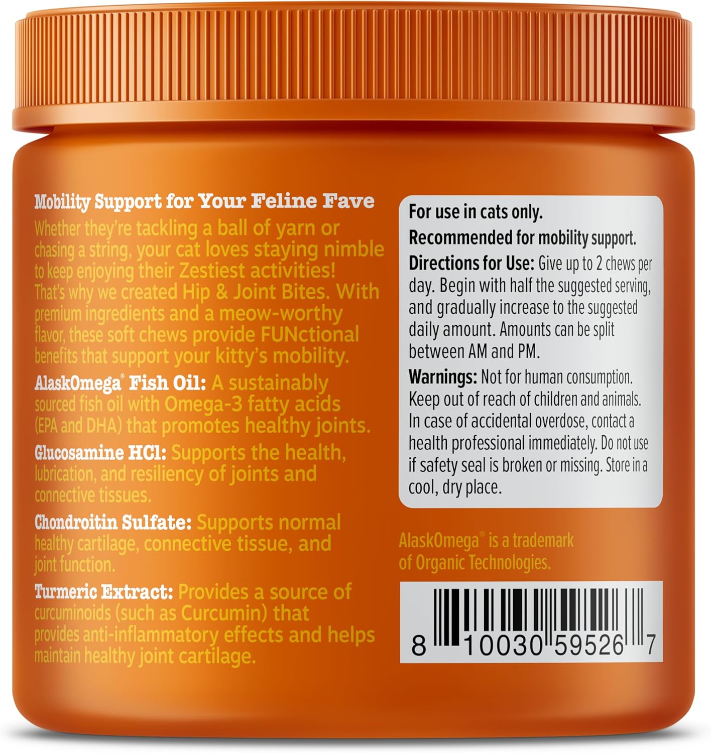 Whether they’re tackling a ball of yarn or chasing a laser pointer, your cat loves staying nimble to keep enjoying their Zestiest activities - big or small! So, it's only natural that you would want to help them stay that way. But, finding a supplement to keep your cat feeling active and happy can be a real pain. But, Zesty Paws is here to give you some relief in your search. With Hip & Joint Bites, you can spoil your kitty companion with premium ingredients, functional benefits, and a meow-worthy flavor that keeps them purring for more. That's because these soft chews feature Glucusamine HCl, Chondroitin Sulfate, Turmeric Extract, and premium AlaskOmega Fish Oil with omega fatty acids (EPA and DHA). Together, these ingredients help to support your cat's hips, joints, cartilage, connective tissue, and lubrication to keep the pep in their step. Best of all, your pet will feel happy and spoiled with special treatment thanks to the delicious flavor, while you no longer have to deal with the hassle of giving them big pills or tablets.