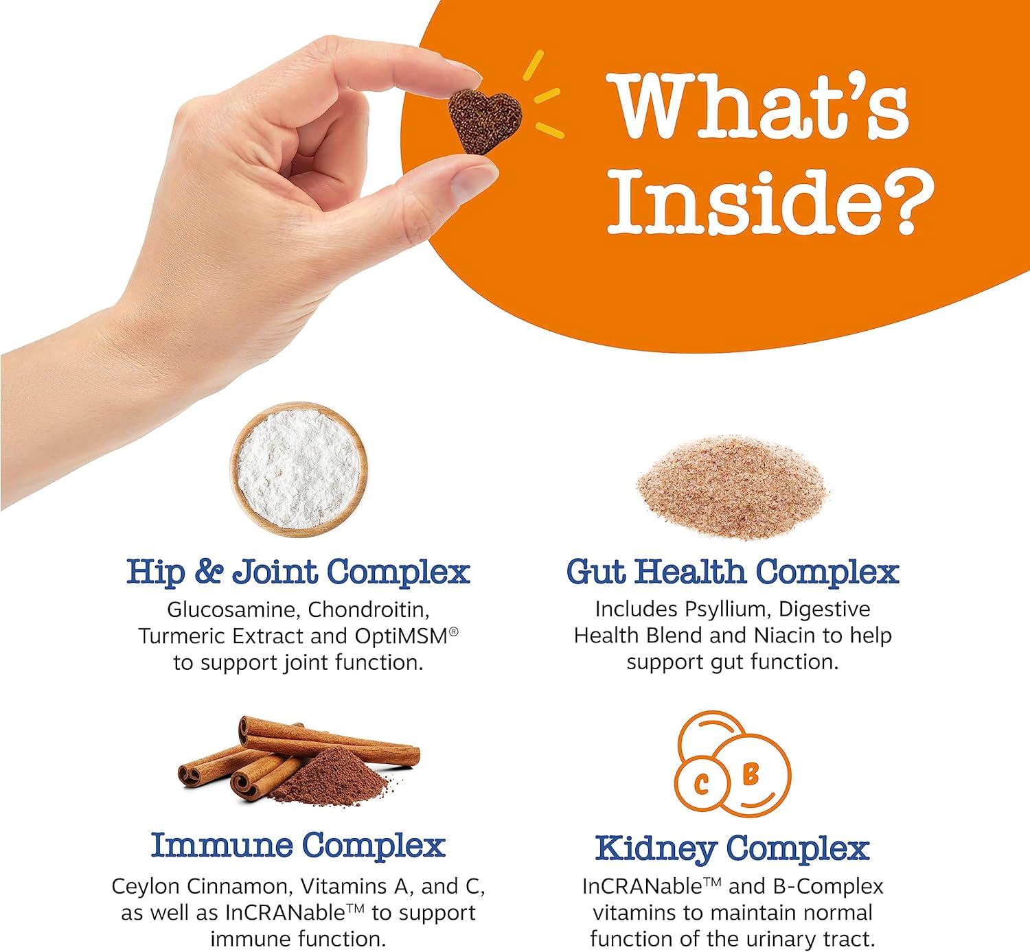 About this item CARDIOVASCULAR, LIVER & BRAIN SUPPORT: This Zesty Paws multivitamin for dogs feature Coenzyme Q10 and Lutemax 2020 for enhanced senior dog vitamins, promoting cardiovascular, liver, and brain health MULTIFUNCTIONAL SUPPORT FOR SENIORS: An 8 in 1 dog supplement with premium ingredients to support physical performance, joints, heart, immune system, and more in senior dogs HIP & JOINT CARE: With Turmeric, OptiMSM, and Glucosamine, this joint supplement for dogs helps hip and joint stiffness, aiding mobility and comfort during daily activities SKIN HEALTH & ANTIOXIDANTS: Formulated with Cod Liver Oil and Vitamin E, a skin and coat supplement for dogs, these chews support skin health and help maintain a healthy coat DIGESTIVE, IMMUNE & BLADDER HEALTH: Enriched with Cranberry, Psyllium, and Ceylon Cinnamon, these dog probiotics for digestive health support gut health, immune function, and bladder health › See more product details