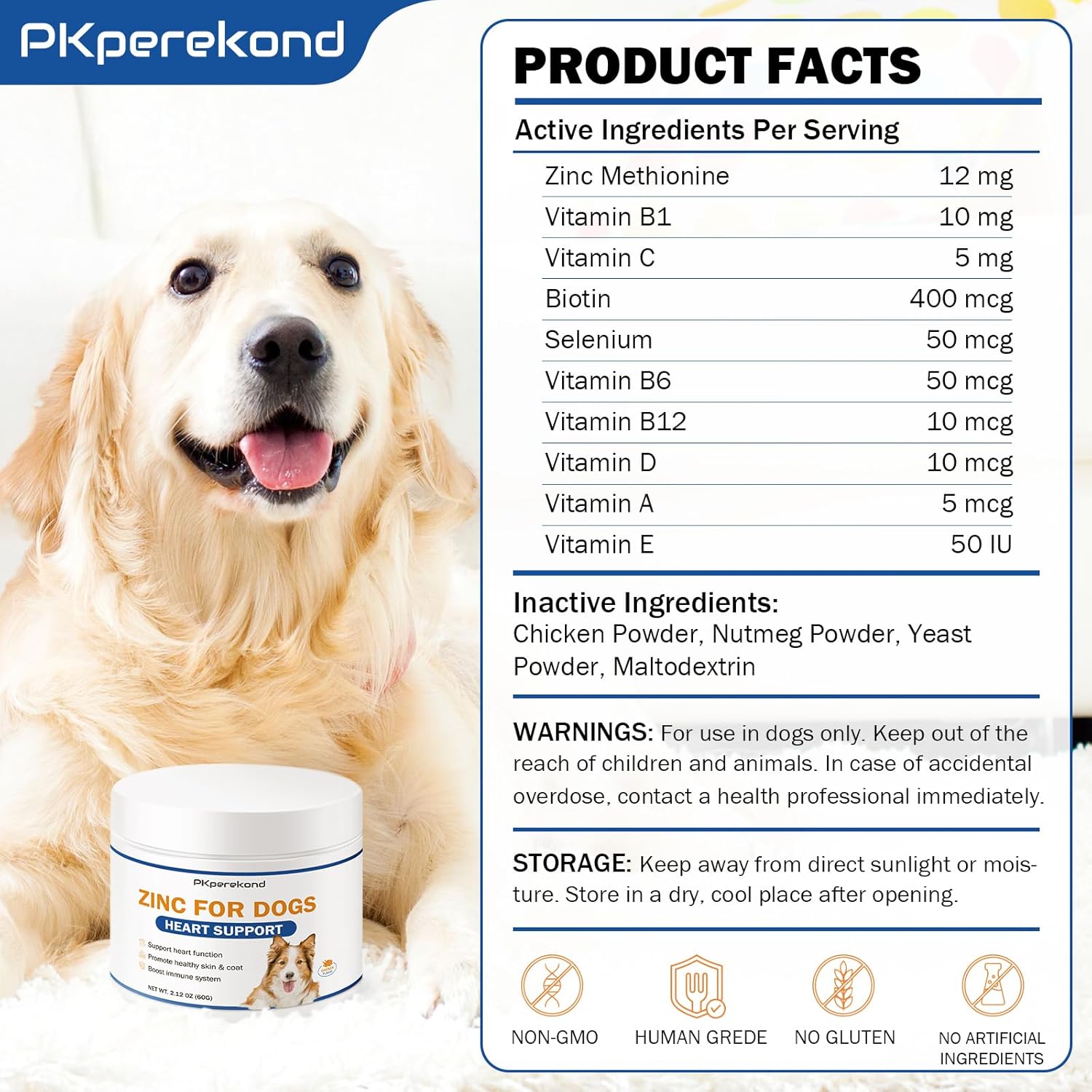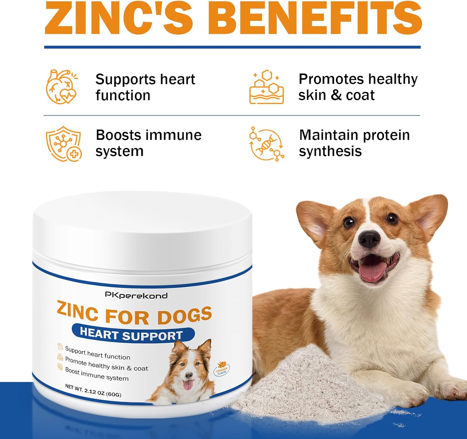 Your dog's heart is at the center of their well-being—give it the support it needs with our zinc-powered formula, enriched with biotin, selenium, and essential vitamins. This carefully crafted blend promotes heart health, immune strength, and overall vitality, helping your dog stay healthy and active.Zinc plays a crucial role in cardiovascular function, enzyme activity, and immune defense, ensuring your dog's body functions smoothly. Selenium and vitamin E provide antioxidant protection, reducing oxidative stress and supporting long-term health. Biotin keeps skin and coat healthy, while vitamins A, C, and D contribute to strong bones, good vision, and a resilient immune system.Beyond heart health, this zinc supplement also aids in cell growth, digestion, and energy production, ensuring your pup absorbs nutrients effectively and stays energetic throughout the day. Whether your dog is young, aging, or recovering, our formula provides the nutrients they need to thrive.Easy to mix with food and suitable for all breeds, this daily supplement is a simple way to invest in your dog's long-term well-being—because a strong heart leads to a long, joyful life by your side.